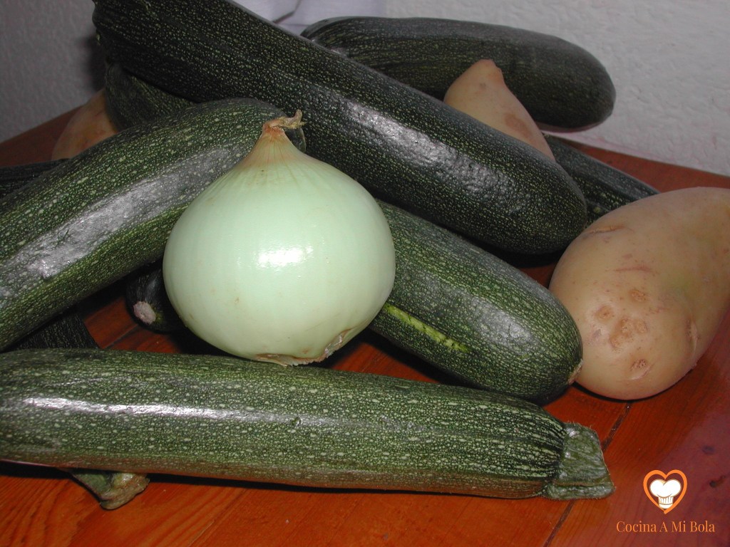 PRIMERO.- Lavar bien los calabacines y cortarlos en rodajas de unos dos centímetros y medio de grosor aproximadamente. Pelar las patatas y las cebollas. Las trocearemos también y lo echaremos todo en la olla expréss.