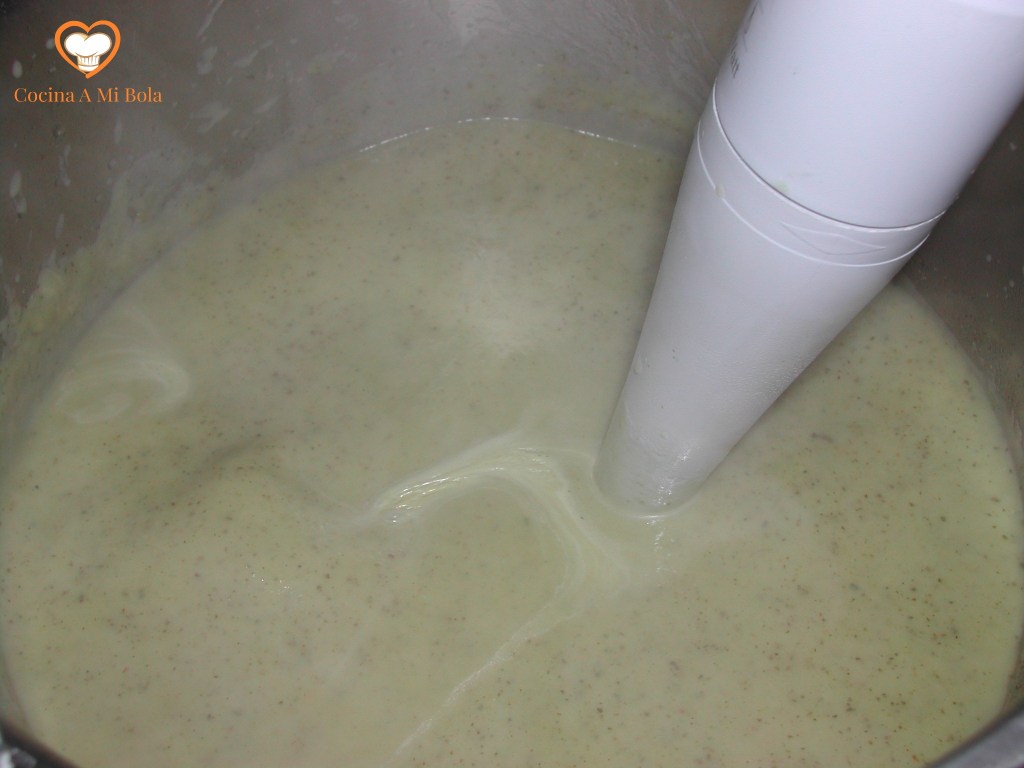 QUINTO.- Triturar todo el contenido de la olla con la batidora eléctrica o robot de cocina. Rectificaremos de sal y añadiremos el queso parmesano. Batiremos de nuevo para que éste funda y haga cuerpo con el resto.