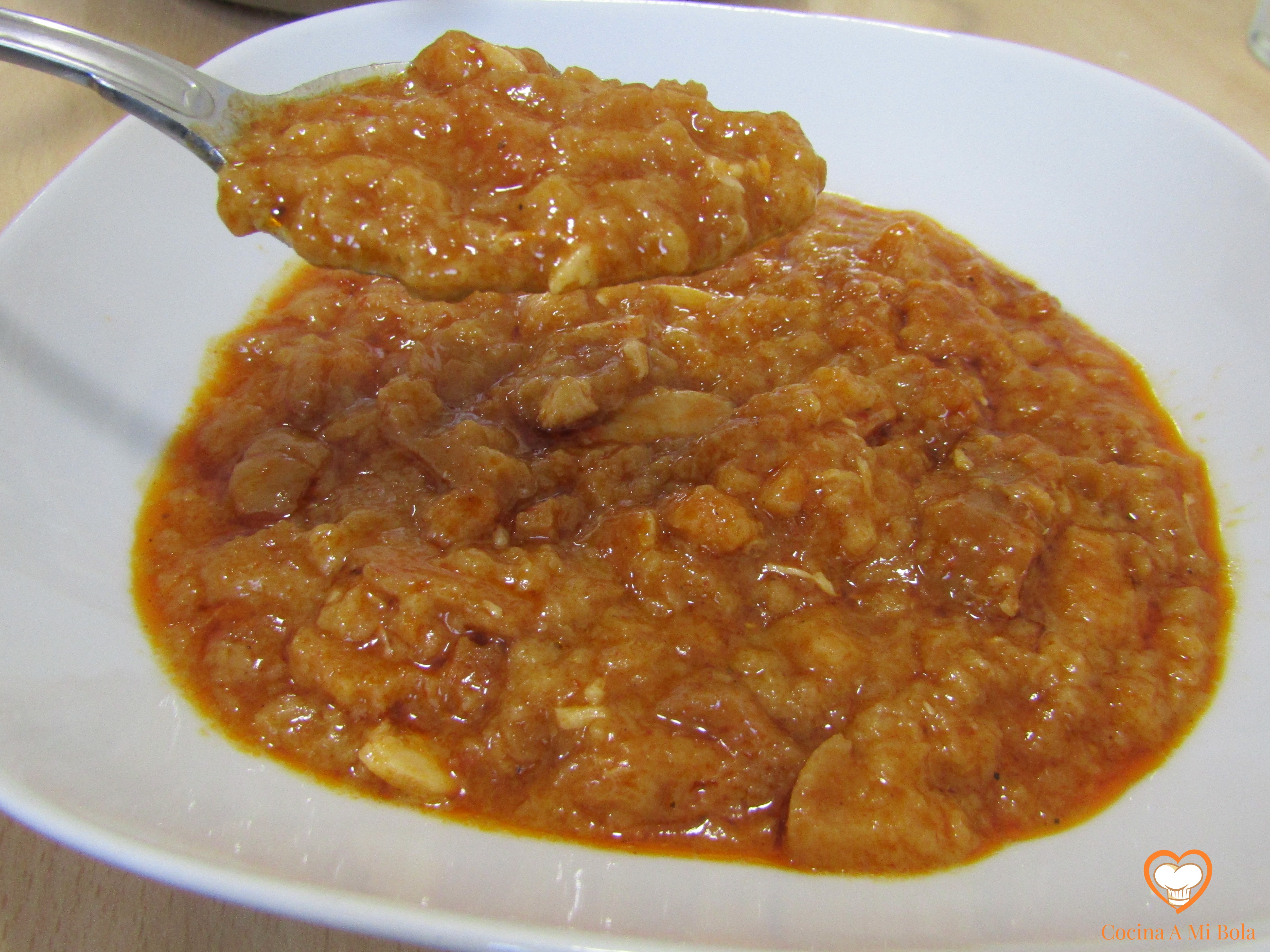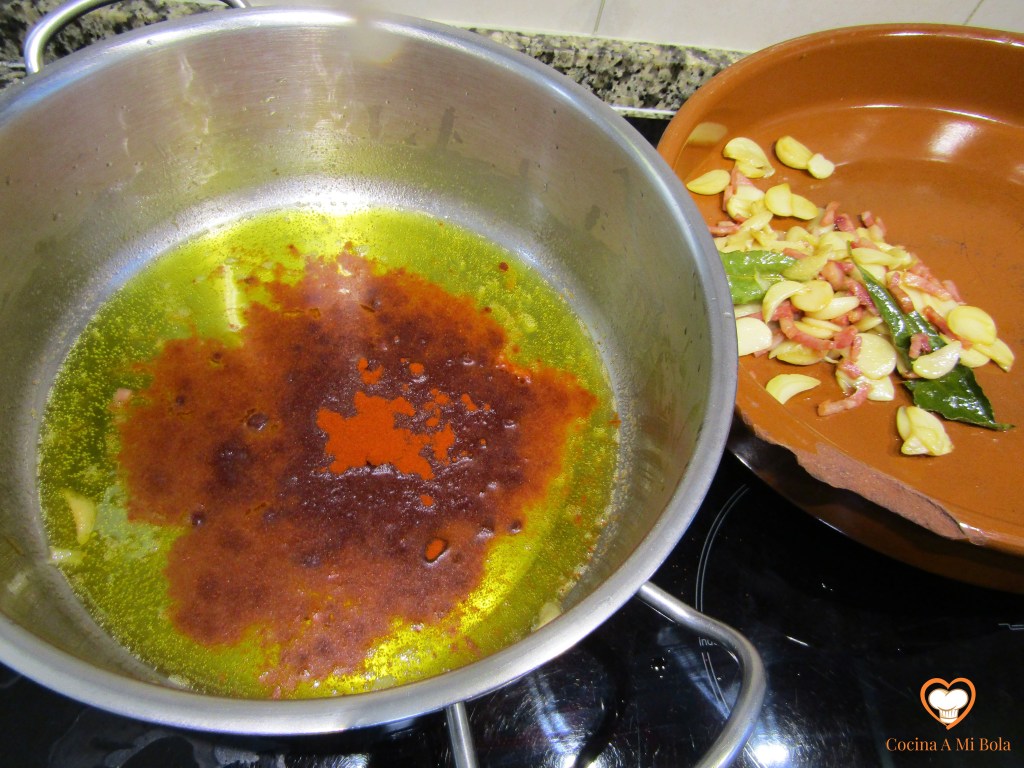 TERCERO.- Una vez que los ajos están blandos y dorados, retiraremos la sartén del fuego momentáneamente para quitarle al aceite un exceso de temperatura y añadiremos una cucharada sopera de pimentón removiendo continuamente. De este modo evitaremos que se queme y nos arruine el guiso. Según los gustos, puede añadirse una cucharadita de pimentón picante o incluso algo más, reduciendo la cantidad del dulce. Por otra parte, el dulce ahumado es una opción estupenda. Si los ajos están ya tiernos, puedes sacarlos momentáneamente antes de agregar el pimentón para que no se doren, y devolverlos después.