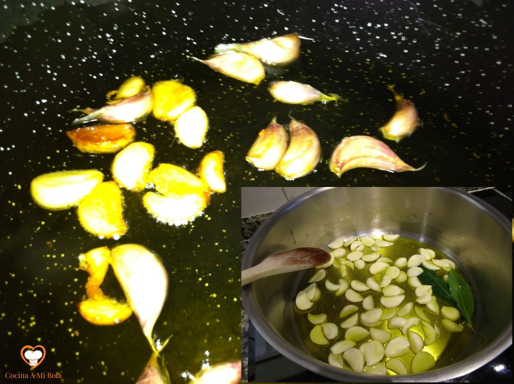 PRIMERO.- En una sartén grande y honda se fríen muy despacio los ajos sin pelar, cortados por la mitad, en abundante aceite de oliva. Deben hacerse por dentro y dejar su sabor, pero sin quemarse ni el propio ajo ni el aceite. Una vez fritos, retiraremos los pellejos. Variación práctica: Para ahorrarse el tener que retirar estas pieles, puedes echar los ajos ya pelados, pero tendrás que hacerlos a fuego mínimo, incluso retirándolos del calor de vez en cuando. Tienen que quedar tiernos por dentro sin quemarse por fuera.