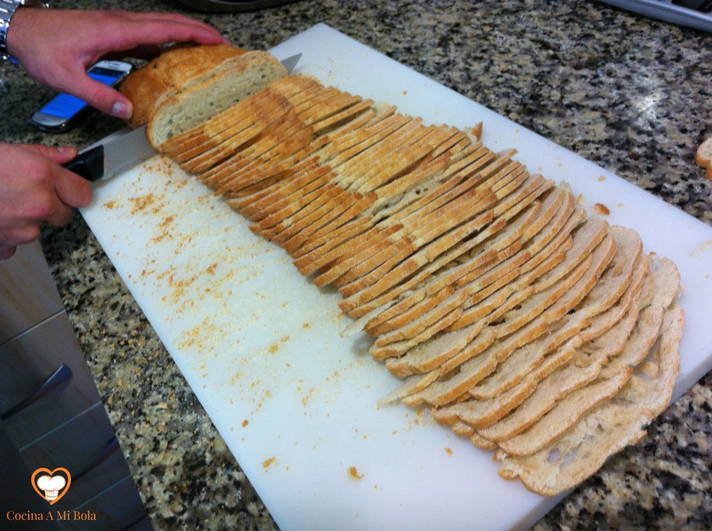 SEGUNDO.- Cortaremos el pan en rebanadas extremadamente finas. Utilizaremos para ello pan del día anterior o a medio descongelar, pues nos facilitará el corte.