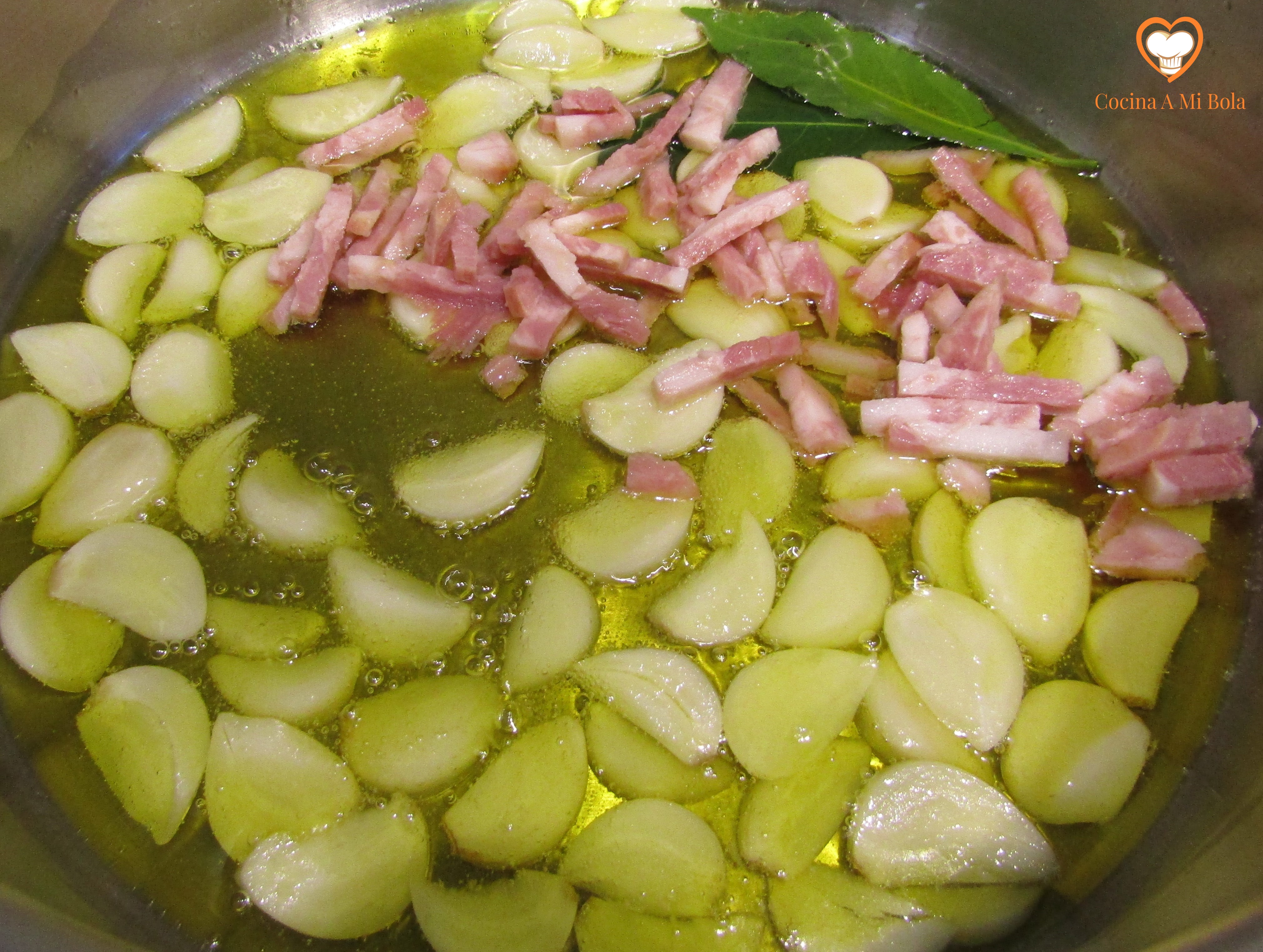 En las cantidades de ingredientes pongo 15 a 20 dientes, aunque a mí me encanta echar mucho más porque dan un sabor espectacular al aceite y al pan, aunque luego deseches algunos…. o no, porque yo los pongo todos. Añadimos el bacon en trocitos pequeños y removemos con suavidad. Pero si es jamón (en taquitos) lo que vamos a poner, lo echaremos al apagar el fuego.