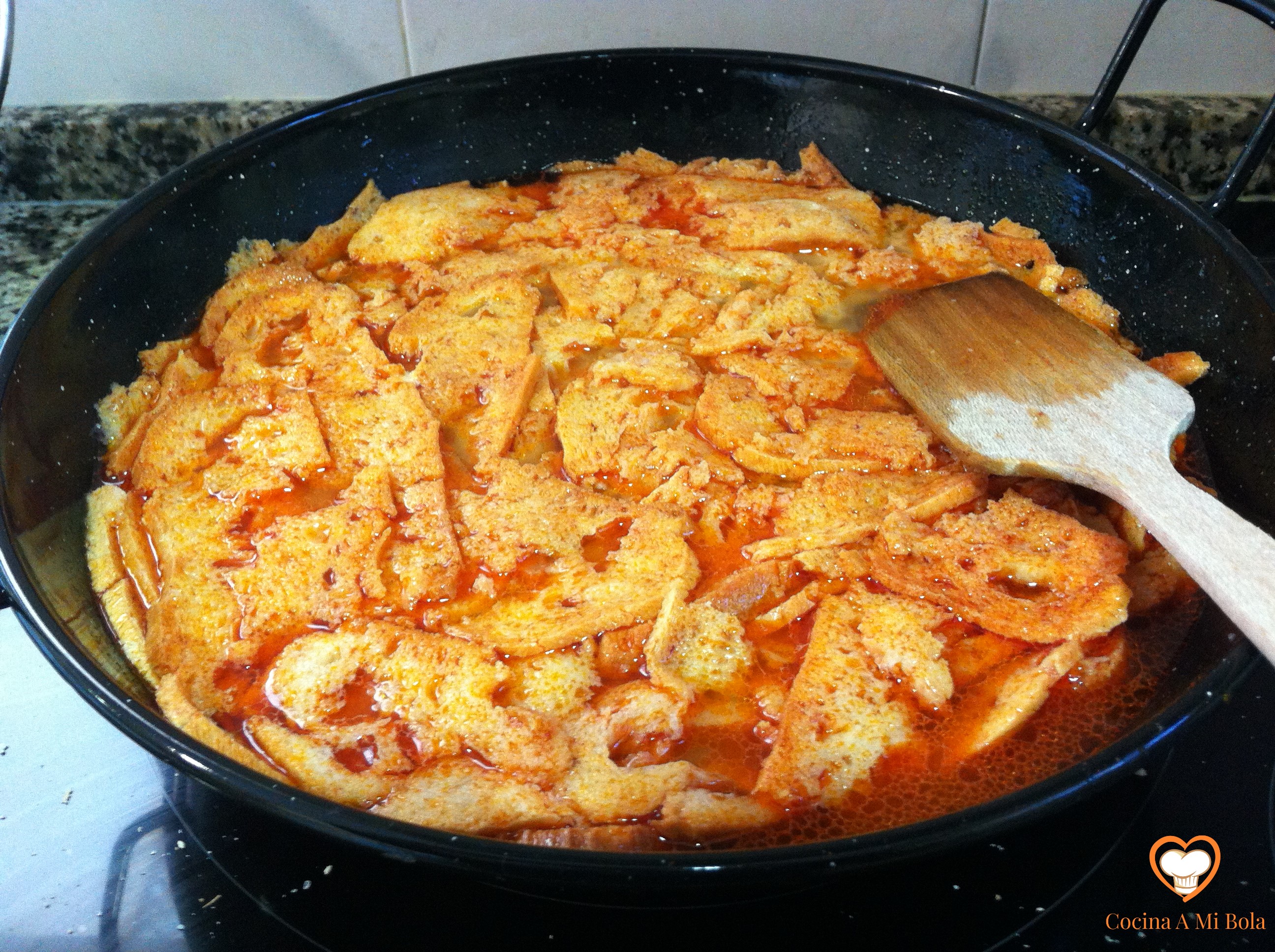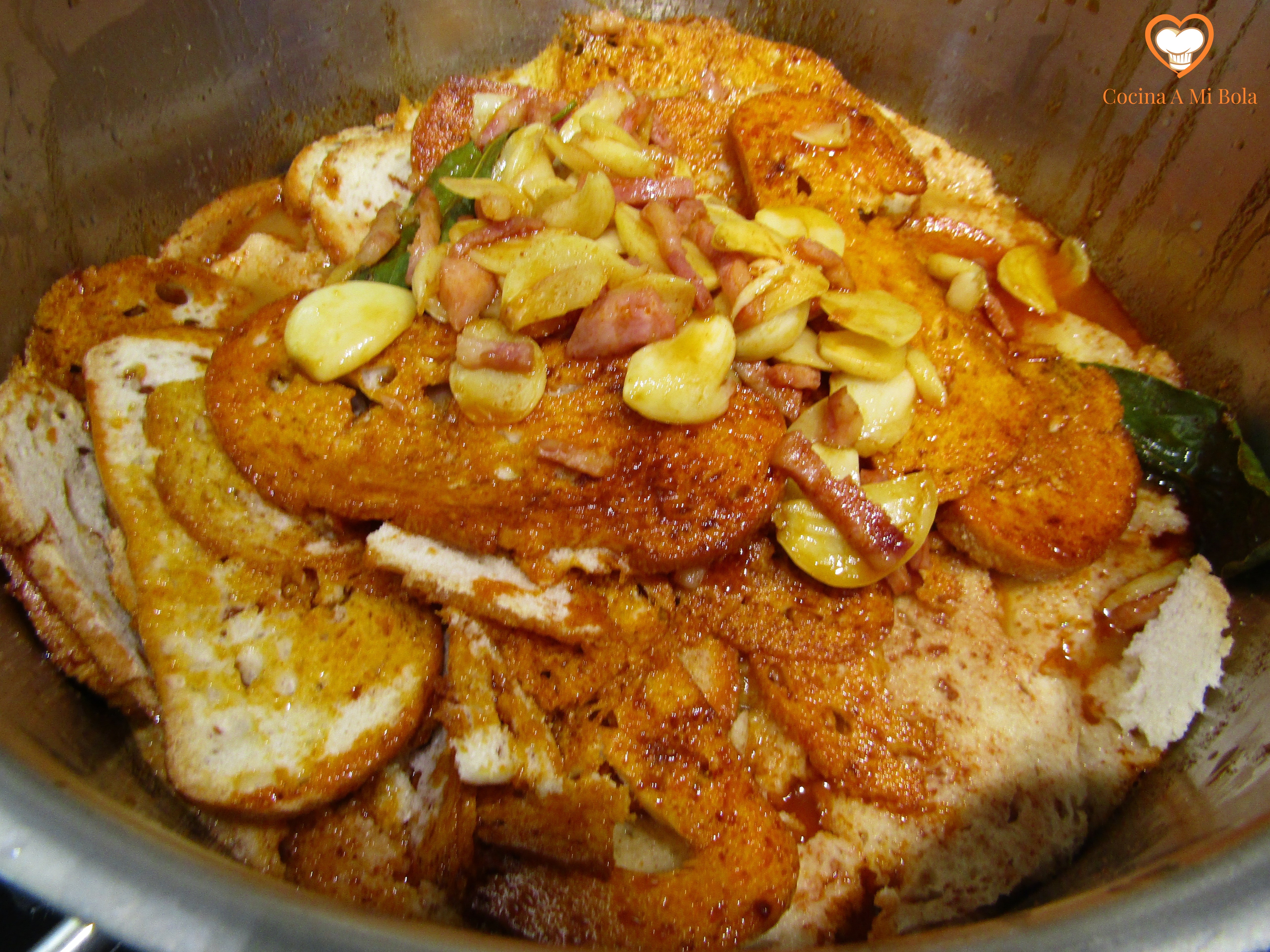 CUARTO.- Ahora es momento de añadir las rebanadas de pan. Las iremos poniendo sobre el aceite de forma que todas ellas vayan empapándose de él y tomando el color rojizo que el pimentón  ha dado a la salsa. Removeremos con cuidado para que no se rompan demasiado y procuraremos que se impregnen todas ellas. No obstante, si se quedan parcialmente blancas, no pasa nada porque al añadir el caldo tomarán un tono adecuado. Una vez hecho, devolvemos a la cazuela los ajos y el bacon si es que llegamos a sacarlo provisionalmente.