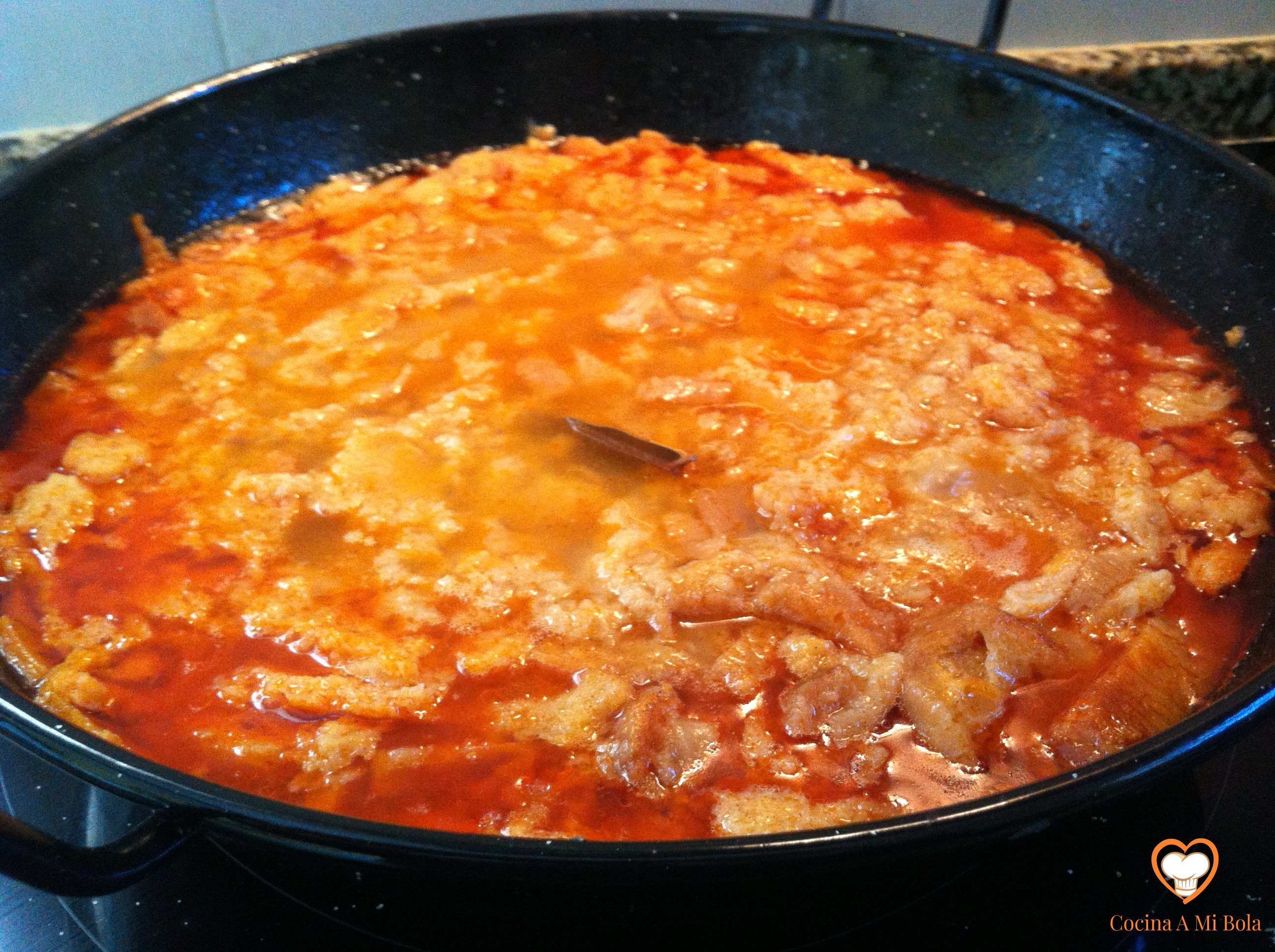 QUINTO.- Ponemos de nuevo la sartén al fuego, ahora más intenso, y agregaremos el caldo de pollo que cubra todo. Probaremos y salaremos al gusto sin olvidar que el jamón, si fuera el caso, intensificará el sabor considerablemente. Habrá de cocer bastante añadiendo agua o caldo si fuera preciso. No establecemos un tiempo concreto de cocción pues dependerá del gusto de cada uno pero teniendo en cuenta que cuanto más tiempo permanezca, mayor suavidad tomarán las sopas de pan.