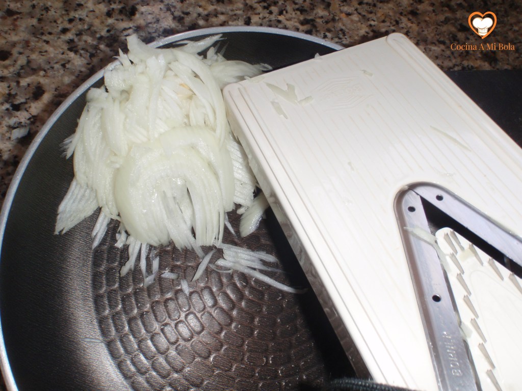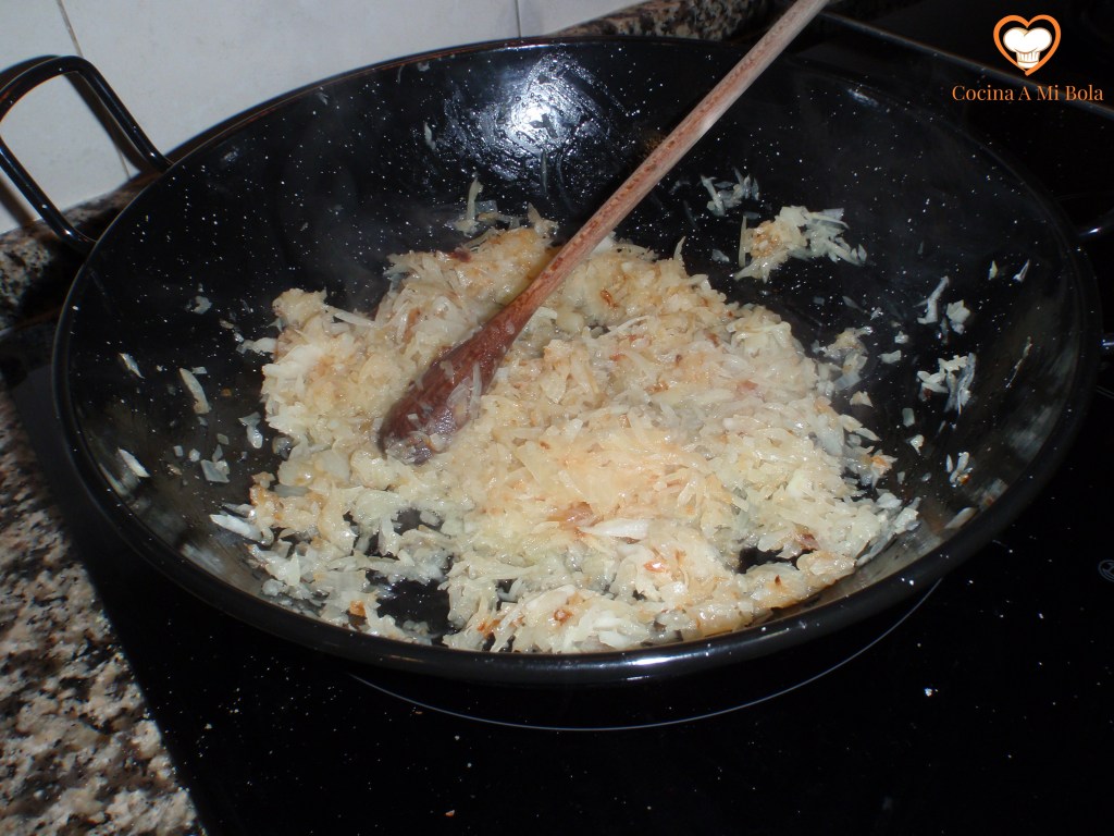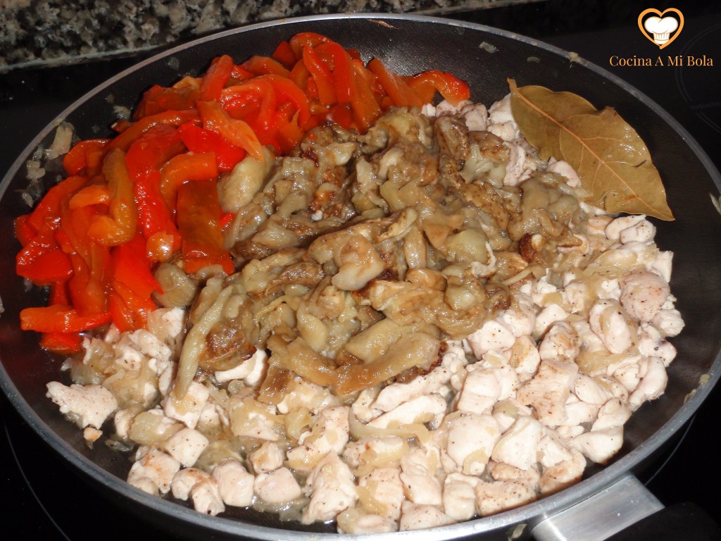 QUINTO.- Picar la cebolla muy fina y  pocharla en una sartén honda grande, con poco aceite de oliva, sal y laurel. Cuando esté dorada y bien pochada, incorporaremos el pollo ya salteado que teníamos reservado. Rehogamos todo medio minuto y apagamos el fuego.