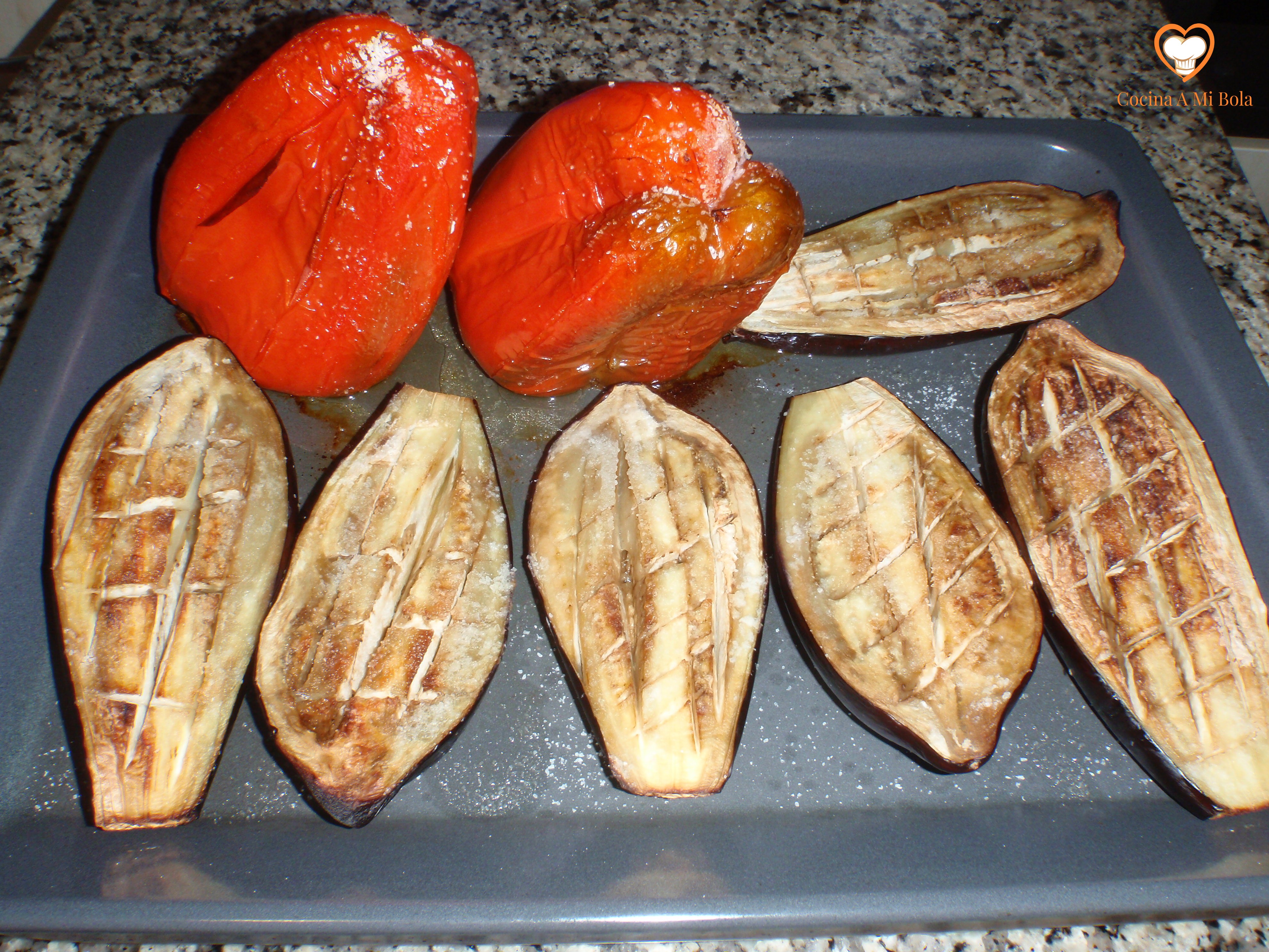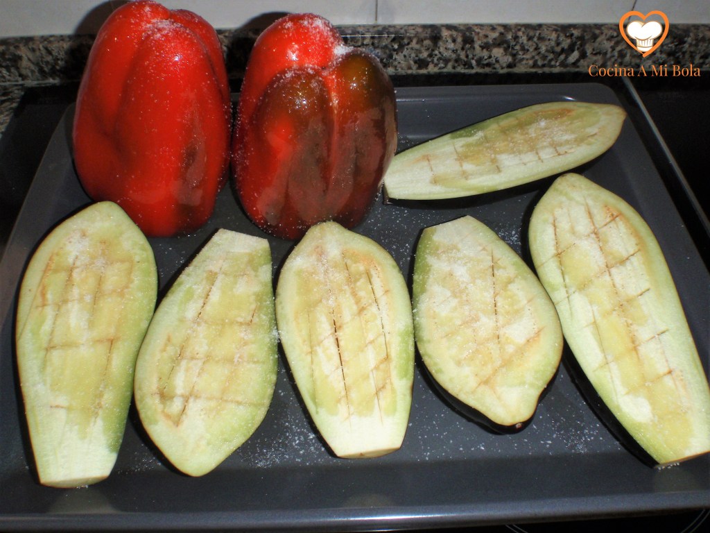 SEGUNDO.- Con un cuchillo haremos unos cortes profundos a la pulpa sin perforar la piel. Aceite por encima y hornear  a 180ºC (calor arriba y abajo+ventilación) hasta que estén tiernas y tostadas. Al mismo tiempo que horneamos las berenjenas, lo hacemos con los pimientos rojos, lavados, embadurnados en aceite con la mano y colocados de pie. Se hará todo en unos veinticinco minutos.