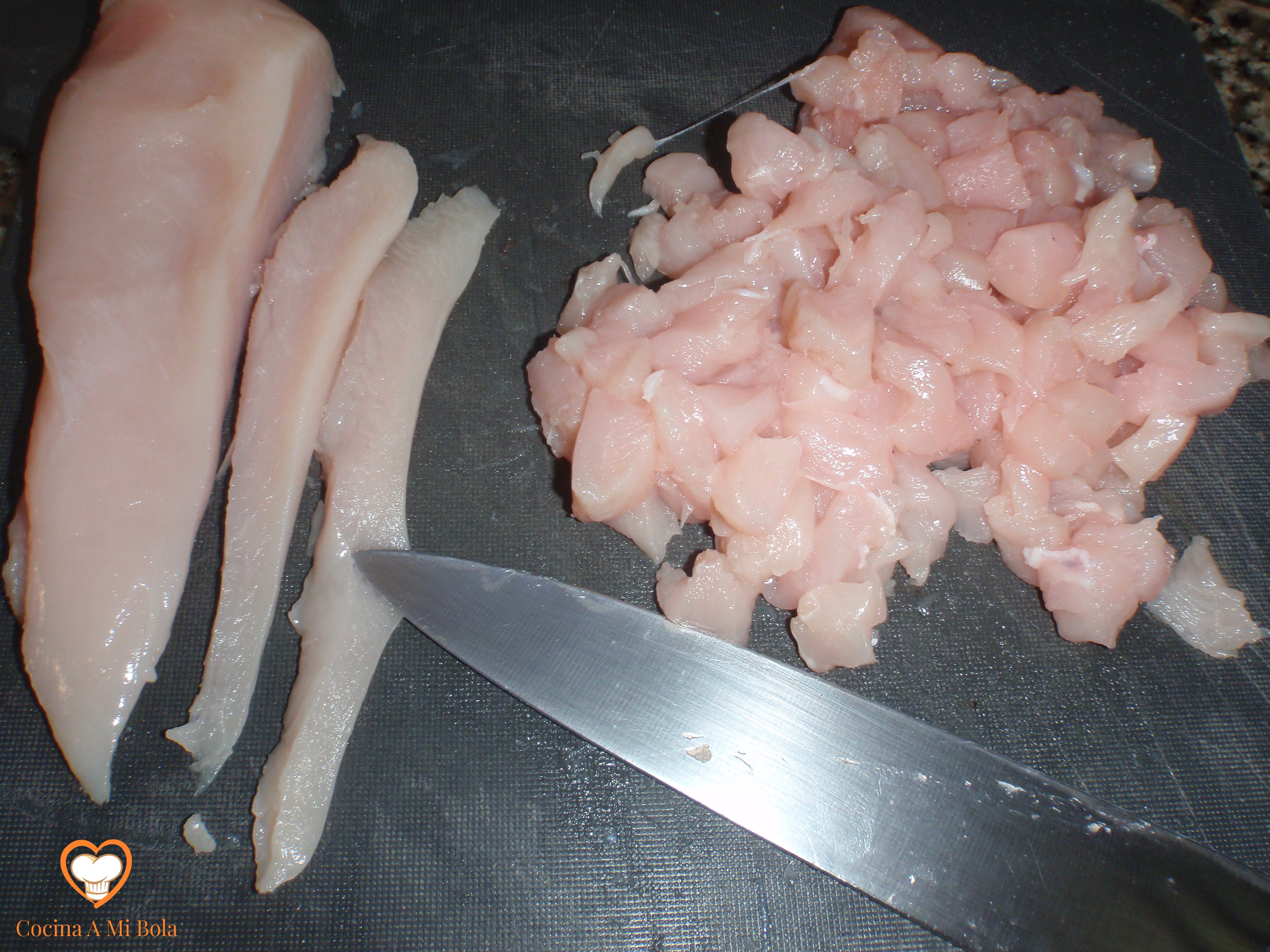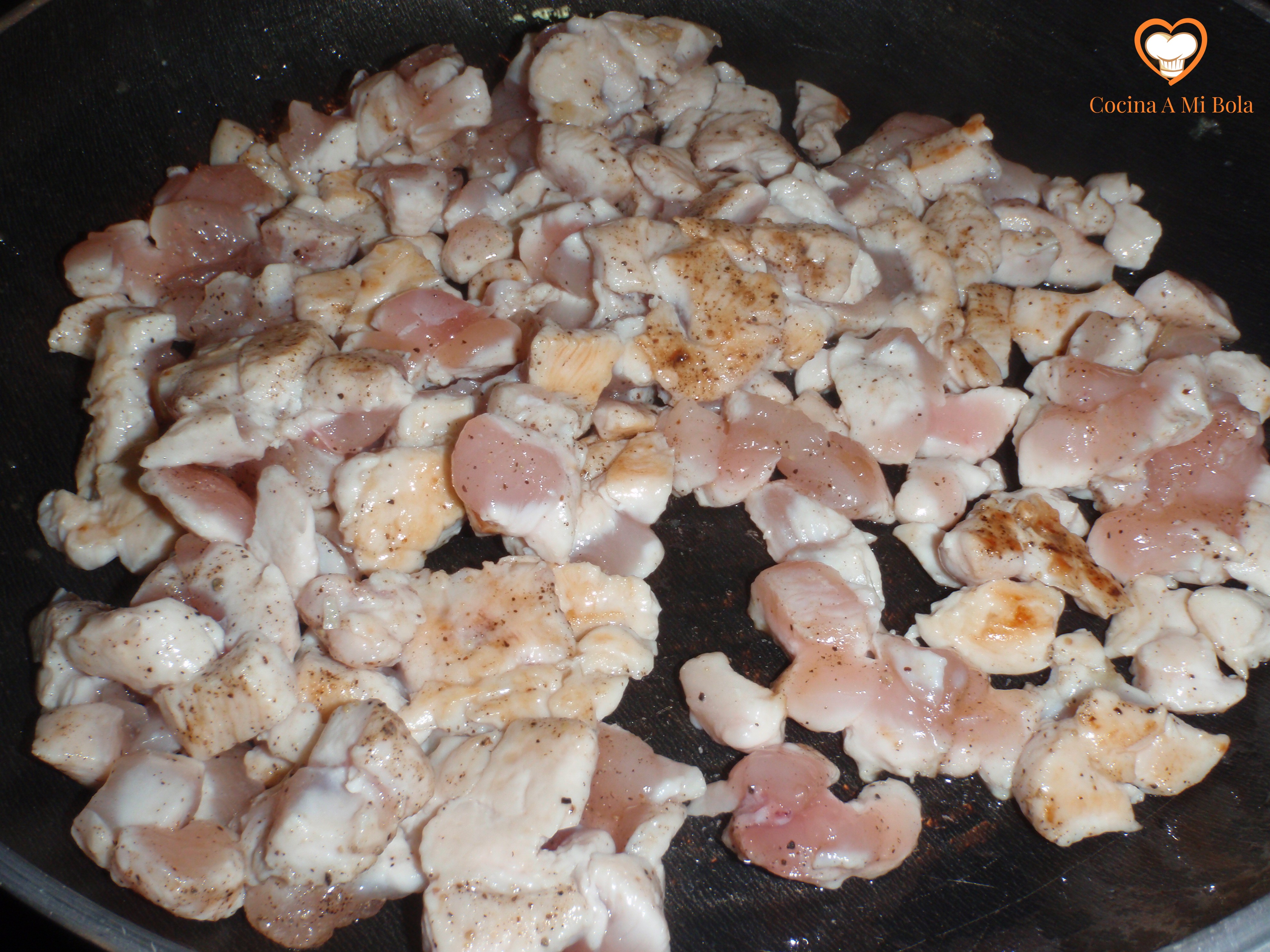 CUARTO.- Mientras tanto, cortaremos las pechugas de pollo en cuadraditos muy pequeños, lo salpimentaremos y lo saltearemos enérgicamente en una sartén amplia con poco aceite de oliva muy caliente. En cuanto tome color lo sacamos y lo reservamos. No queremos que se seque.