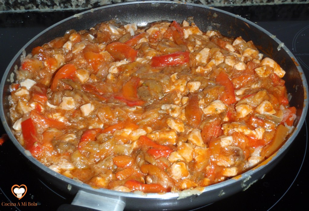 INGREDIENTES: 3 berenjenas, 2 pechugas de pollo, 1 cebollas, 2 pimientos rojos de asar, 6 lonchas de queso cheddar, pimienta negra molida, aceite de oliva virgen extra, 200 grs tomate frito, orégano, 1 hoja de laurel y sal.