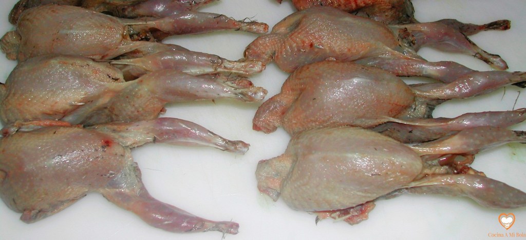 PRIMERO.- Comenzaremos la víspera manipulándolas con muchísimo cuidado para no romper su delicada piel, lavar y eviscerar bien las codornices. Cortarles la cabeza y quemar a la llama los restos de plumaje que pudieran quedar sobre la piel. Secarlas con un trapo o papel de cocina y salpimentarlas por dentro y por fuera sin excedernos pues salarán demasiado la salsa. Espolvorearlas con ajo molido y tomillo, también moderadamente.
