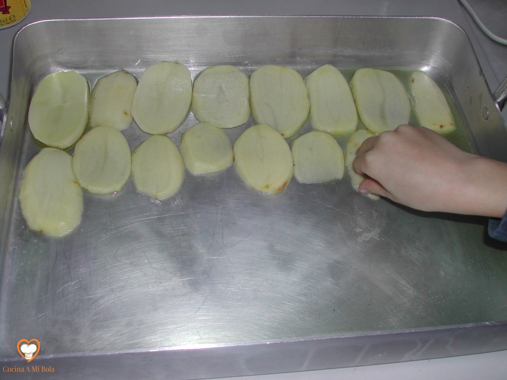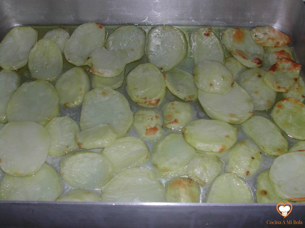 QUINTO.- Meteremos la fuente en el horno precalentado y a una temperatura de 190ºC, con circulación de aire, rociándolas con un hilo muy fino de aceite de oliva, esta vez sobre ellas. Es importante que no se hagan demasiado ya que solo se trata de cocerlas algo más de tiempo que la carne .