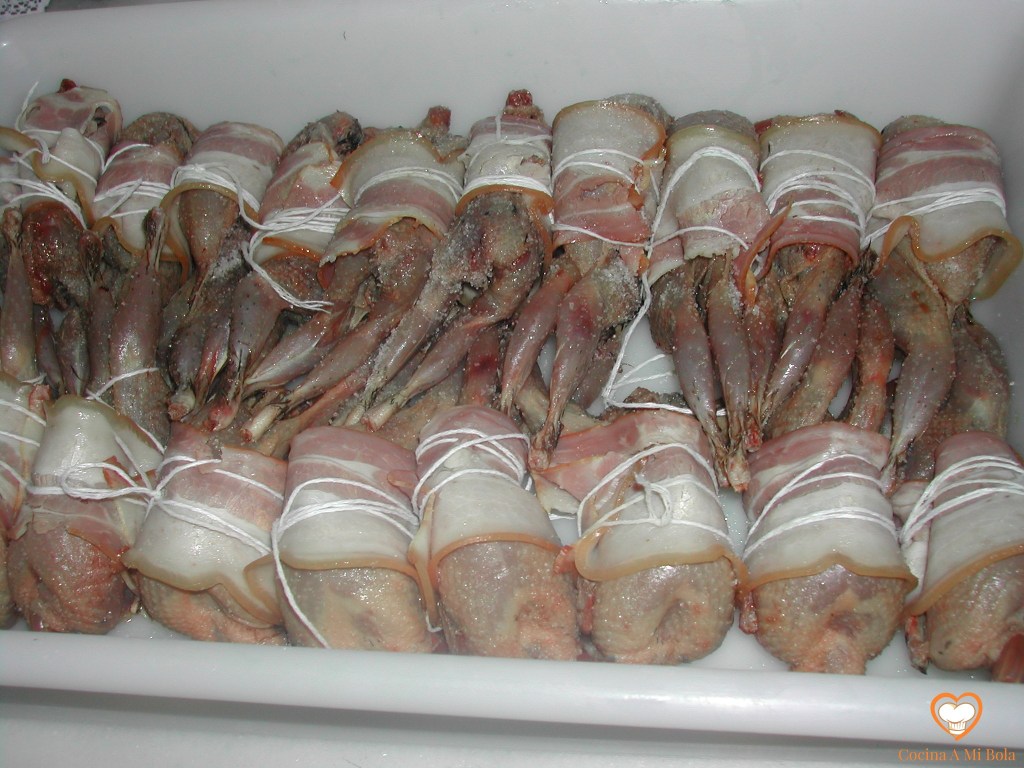 SEGUNDO.- Envolver cada una de las aves en una loncha de bacon (o dos si fuera preciso) y atarlas con bramante de cocina sujetándoles los muslos, en la medida de lo posible. Las colocaremos en un balde de forma que quepan todas ellas de manera ordenada y las regaremos ligeramente con vinagre de Jerez pasando una sola vez por encima de cada una de ellas. Ahora, añadiremos el vino blanco y el fino por los bordes del recipiente, evitando así “lavar” con el vino los condimentos y especias con las que hemos ido aderezando las codornices.