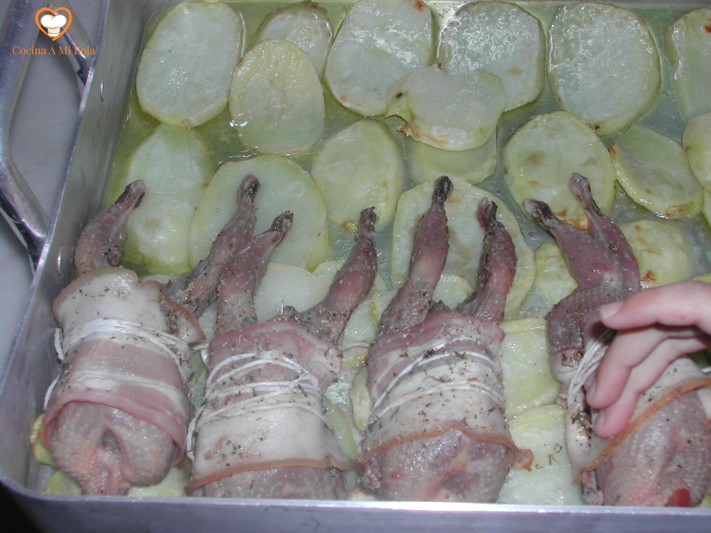 INGREDIENTES: 12 a 15 codornices, 12 a 15 lonchas de bacon ahumado, 15 dientes de ajo, 3 cebollas, 3 patatas grandes, vino blanco, vinagre de jerez, 1 vasito de fino, tomillo, sal, pimienta negra molida, ajo molido, 12 huevos de codorniz, aceite de oliva virgen extra.