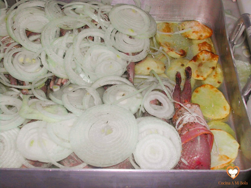 SEXTO.- Mientras tanto, cortaremos las cebollas en aros procurando que éstos no se separen demasiado unos de otros. Sacar la fuente del horno sin apagarlo y colocar en ella ordenadamente las codornices sobre la cama de patatas. Cubrirlas todas ellas por encima con las rodajas de cebolla. Se trata, como hicimos con las patatas, de evitar una pérdida drástica de humedad. Las perdices tienden a secarse rápido por lo compacto de su carne y su pequeño tamaño.