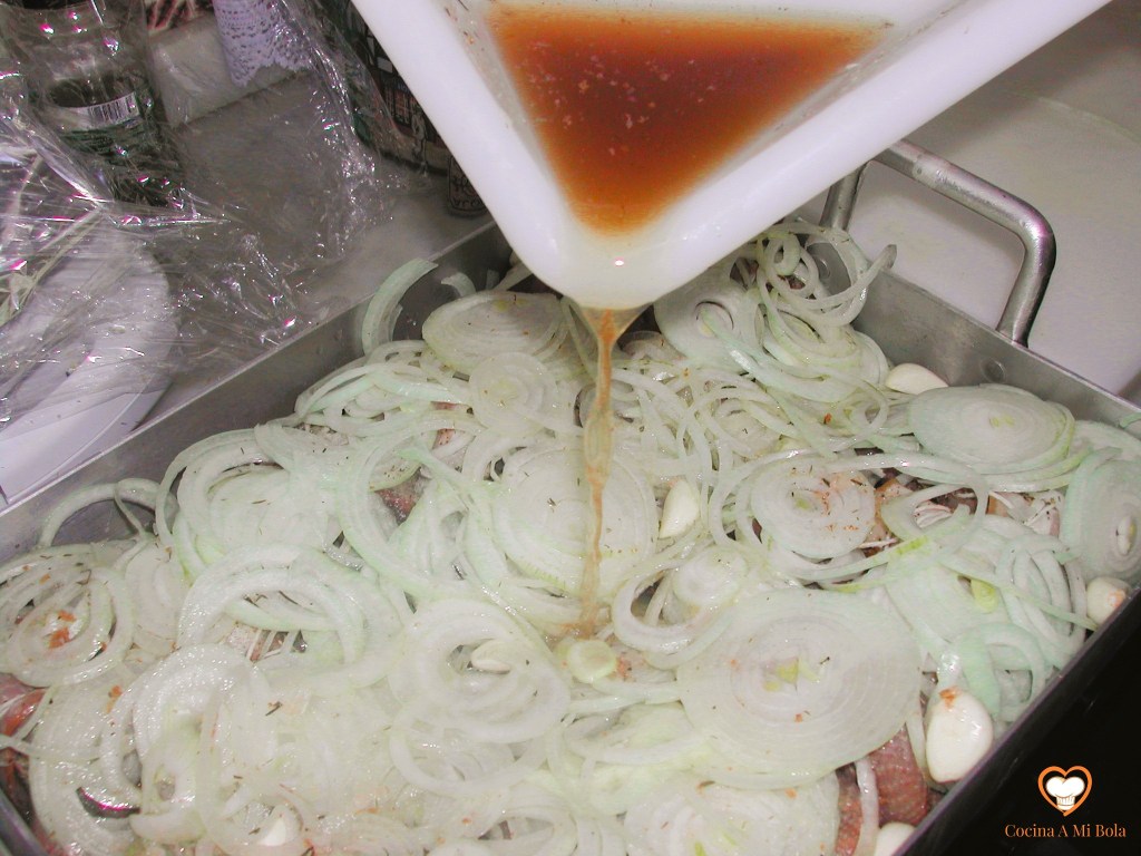 SÉPTIMO.- Agregaremos sin regarlas el resto del aliño de vino en el que las hemos tenido macerando y la meteremos al horno. Subir la temperatura a unos 200º C.