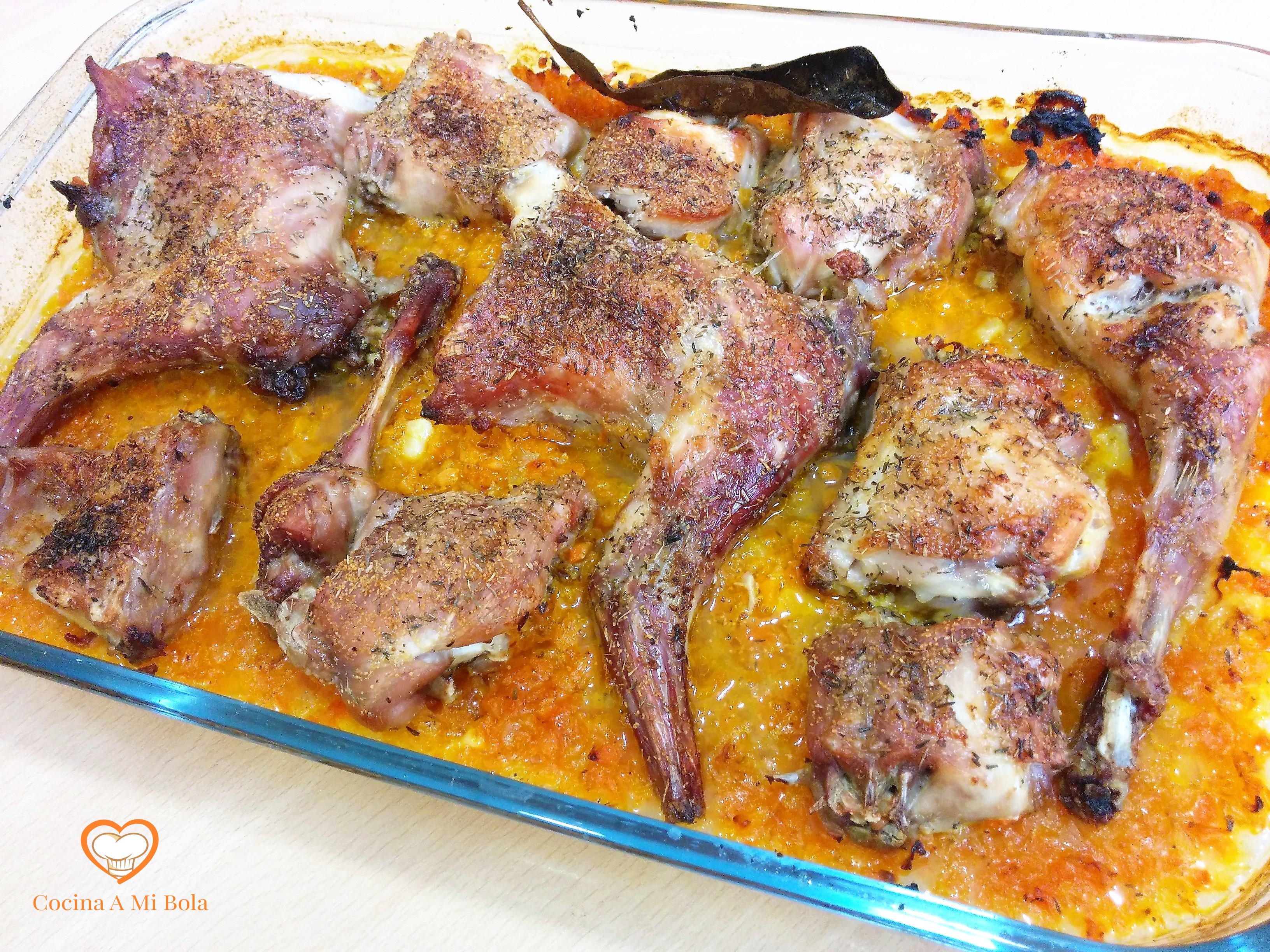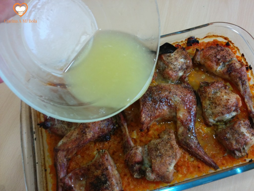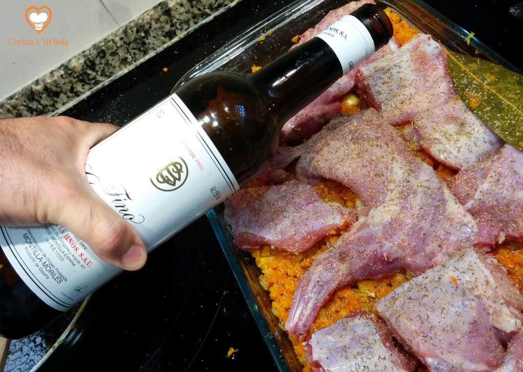 CUARTO.- Colocaremos las tajadas de conejo de forma que no se monten unas en otras, añadiremos el vino blanco mezclado con el jerez de forma regular por toda la superficie y lo meteremos al horno durante unos 40 minutos aproximadamente. Si consideras que debe estar algo más, hazlo. Lo dejo a tu criterio porque cada horno es diferente. Yo he tenido que corregir esta receta porque con mi horno anterior era una hora y con este más moderno le sobran veinte minutos.