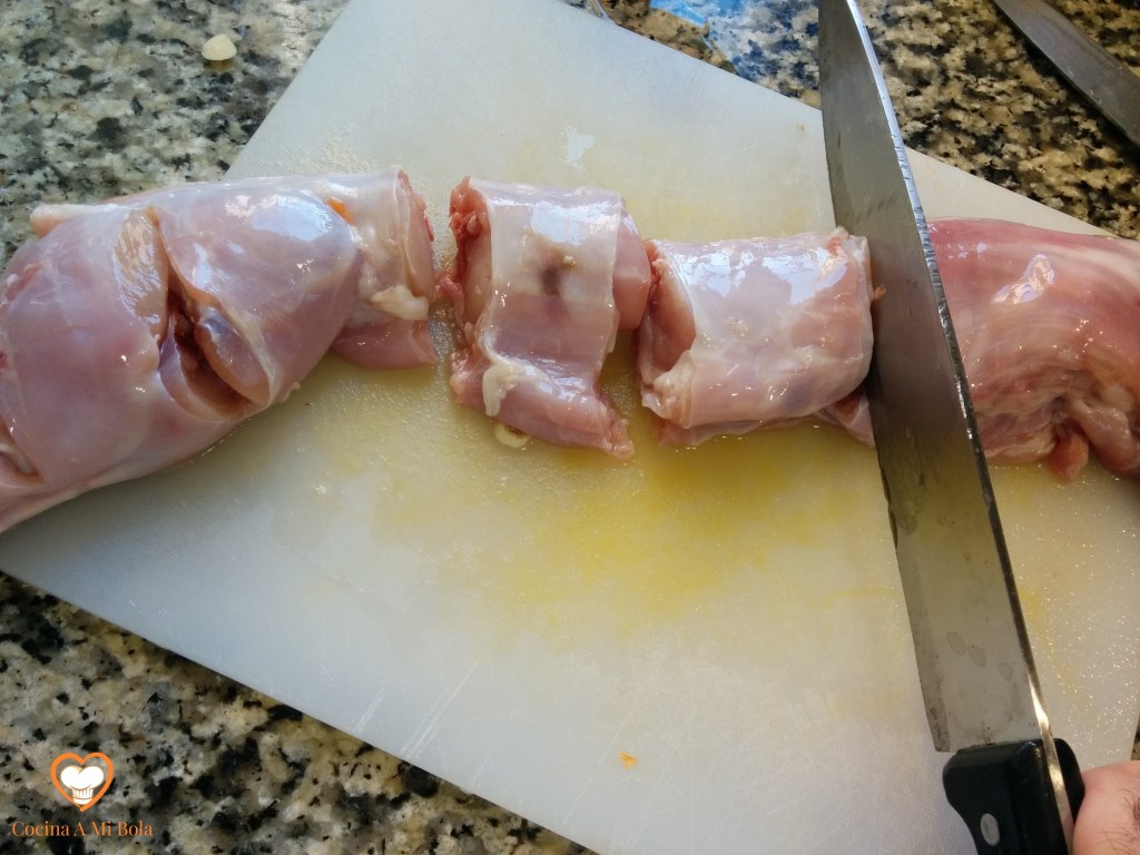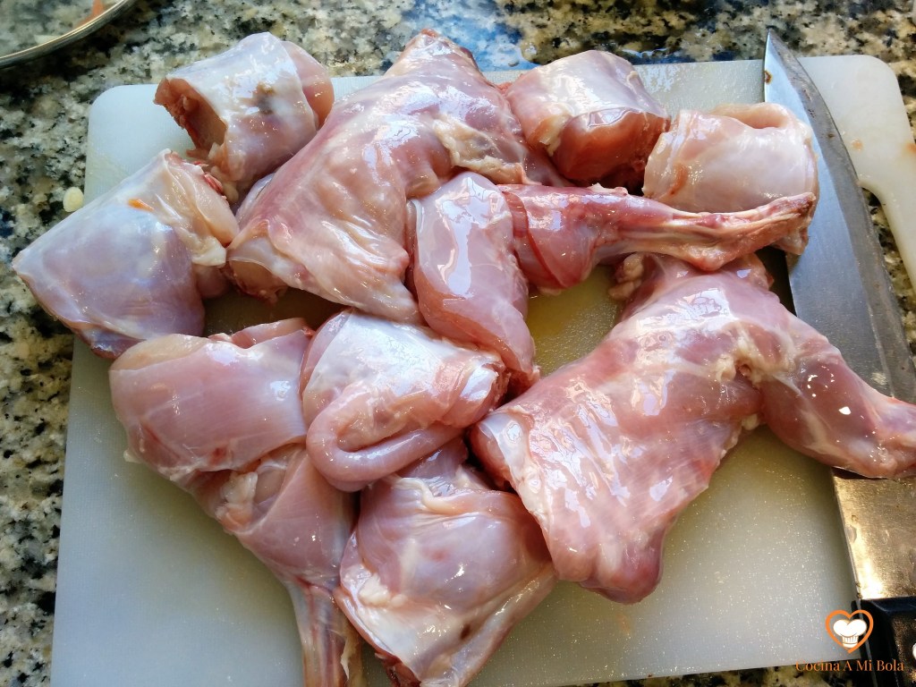 PRIMERO.- Se lava bien el conejo, se le quitan las vísceras y se eliminan todas las partes de grasa o sebo blanco y lo cortamos en trozos. Lo salpimentamos y lo espolvoreamos con ajo molido.
