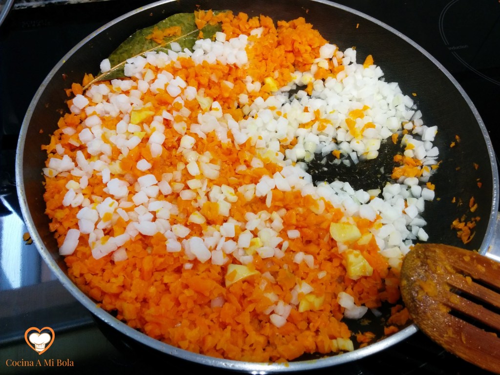 SEGUNDO.- Picaremos bien la zanahoria y la cebolla. Pondremos la primera a pochar en una sartén grande junto con los dientes de ajo cortados en trocitos y una hoja de laurel en un poco de aceite de oliva. Al cabo de unos cinco minutos, añadimos la cebolla. Salpimentar y remover de vez en cuando.
