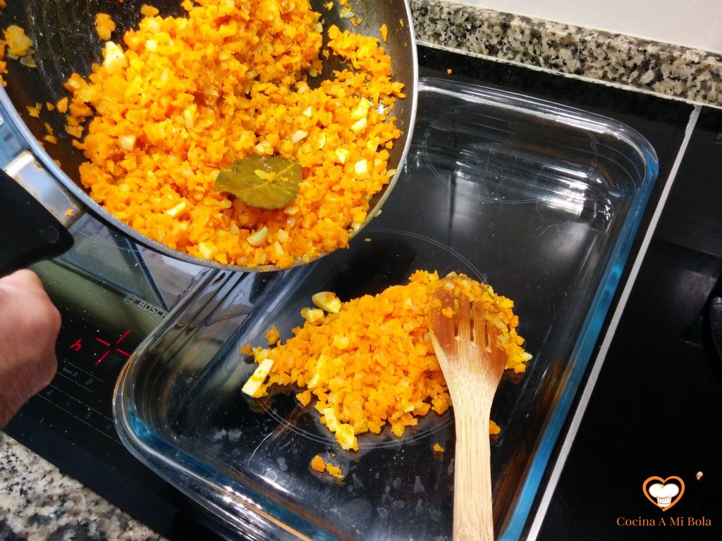 TERCERO.- Enciende el horno a 200ºC, calor arriba y abajo con circulación de aire. Cuando esté tomando el sofrito un tono algo dorado y con aspecto de estar reblandecido, rectificaremos de sal y retiraremos del fuego. Vierte el contenido de la sartén sobre una fuente de horno y repártelo por ella a modo de cama.