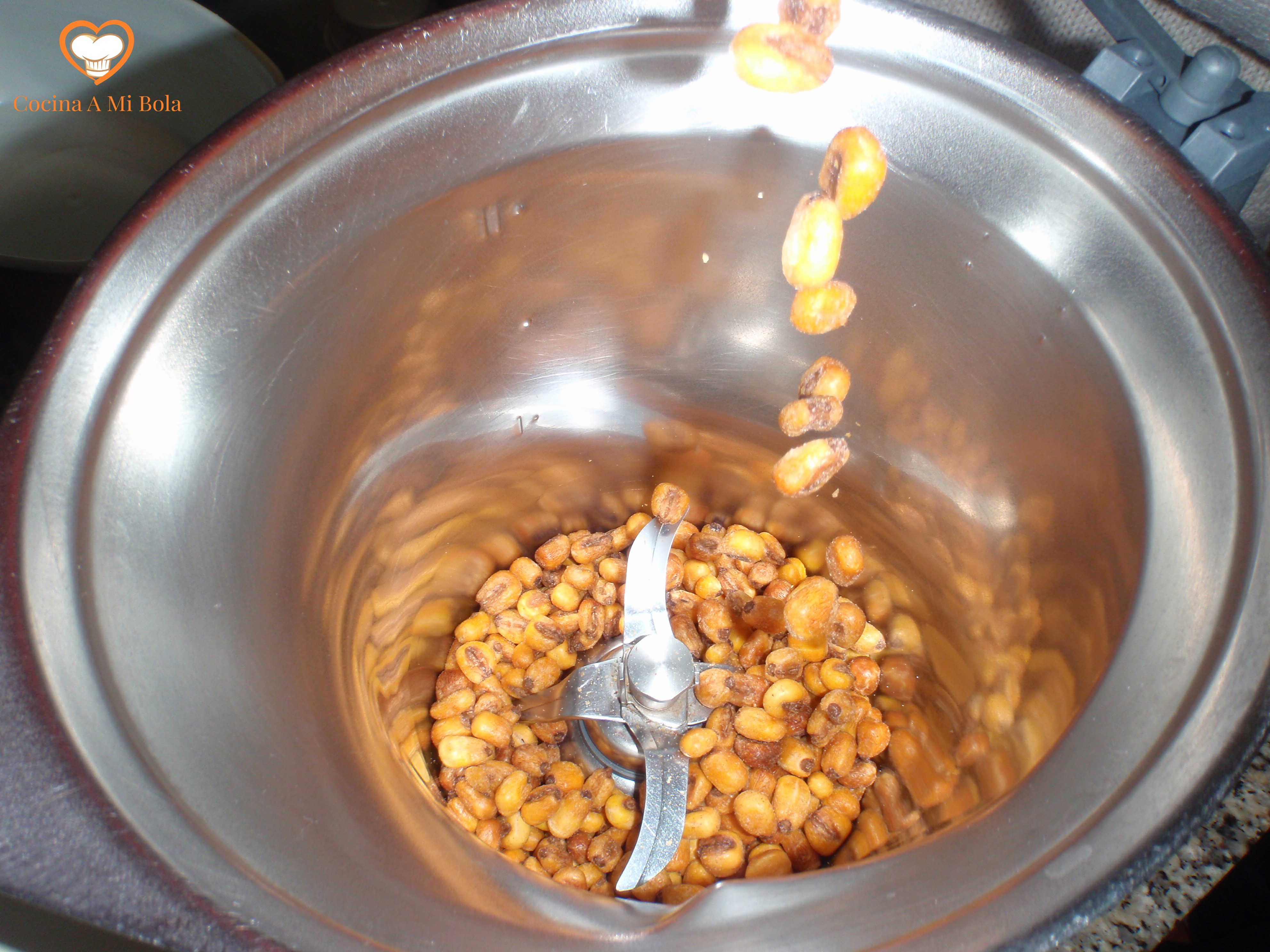 CUARTO.- Echamos los kikos en el robot de cocina y los picamos para que tomen una textura algo más gruesa que el pan rallado. Naturalmente, es a ojo, así que vigila para que no se hagan harina.