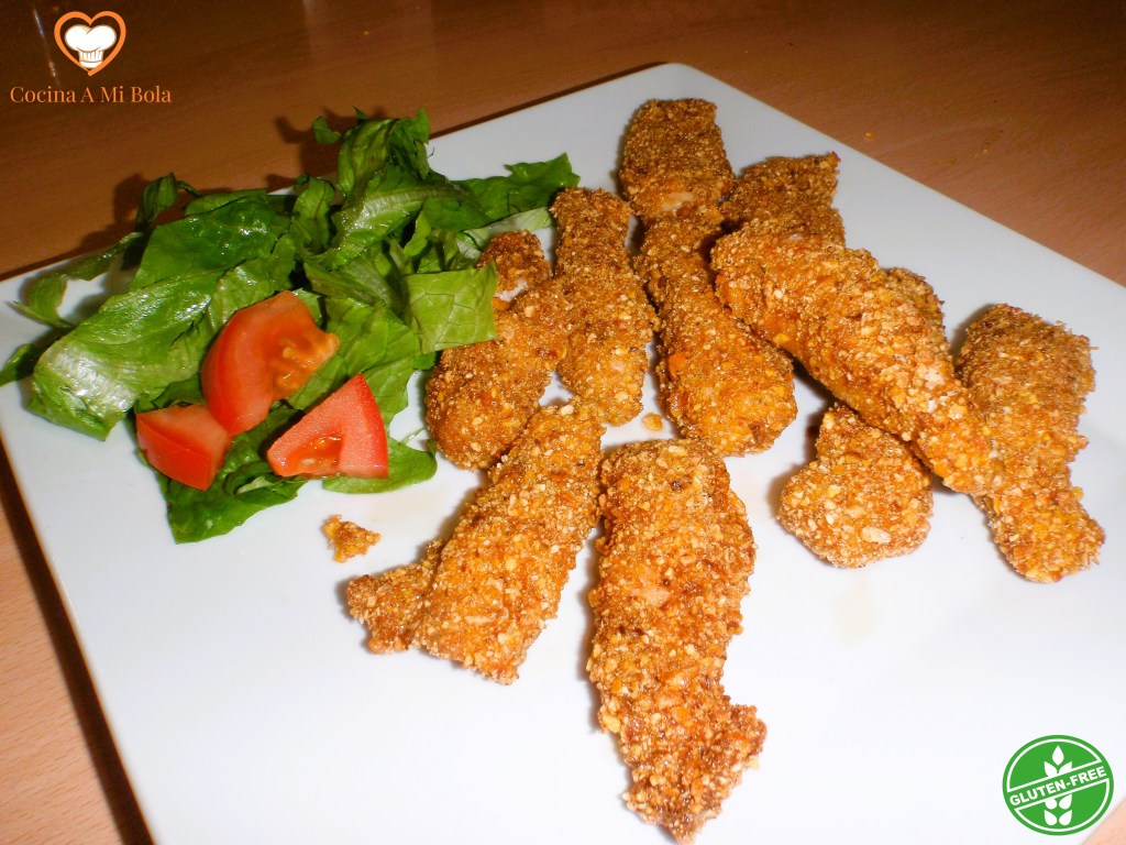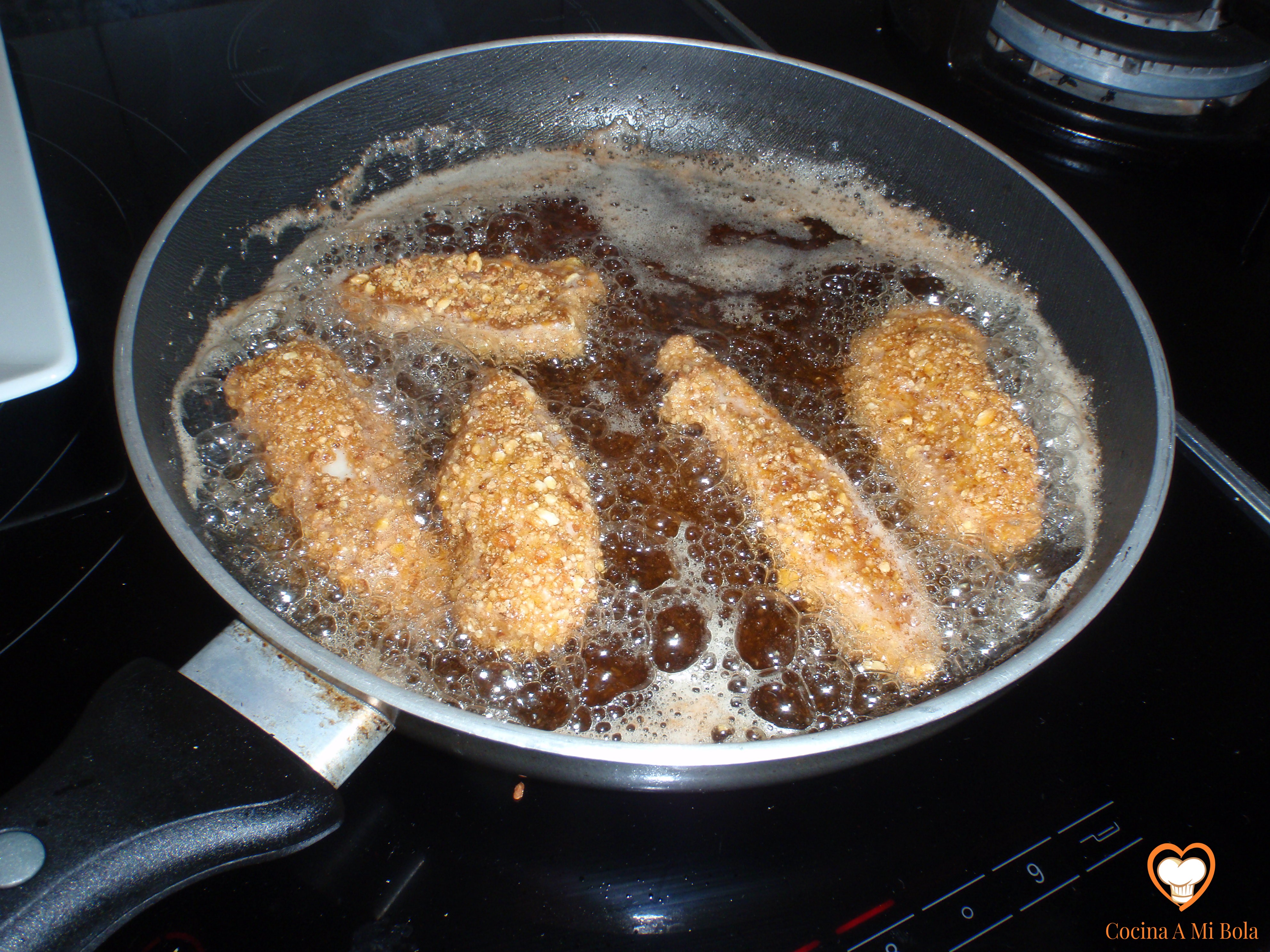 SEXTO.- Con ayuda de un tenedor, iremos sacando las tajadas de pollo, una a una y las rebozaremos en el maíz molido exactamente igual que si lo empanáramos.