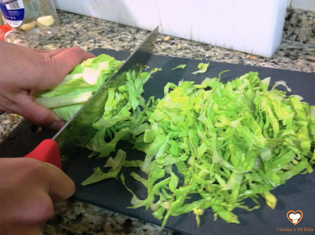 PRIMERO.- Se lava bien la lechuga y se corta en tiras finas, tal y como haríamos para un cocktail de gambas. La centrifugaremos para que elimine el agua por completo y la reservaremos.