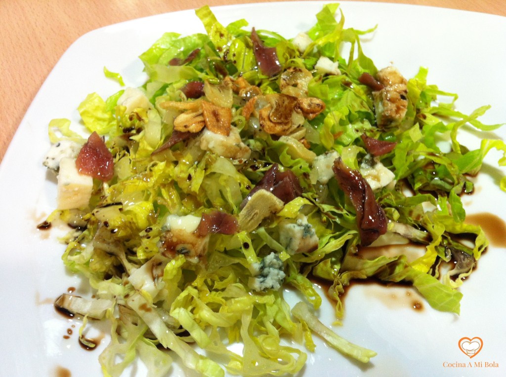 INGREDIENTES: Para 2 personas: ½ lechuga, 100 gr. queso roquefort, 1 lata de anchoas en aceite de oliva, 8 dientes de ajo,  vinagre de jerez, aceite de oliva virgen extra y sal.