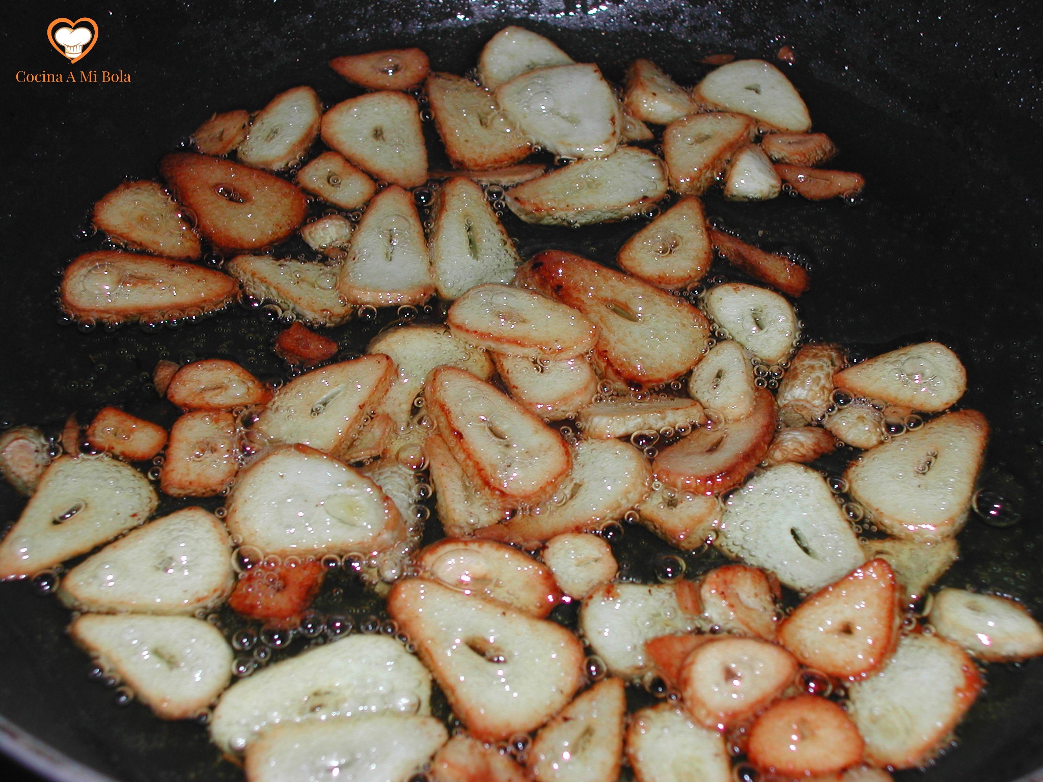SÉPTIMO.- Y por último, picaremos los dientes de ajo en trozos muy pequeños o finas lonchas y los doraremos en aceite de oliva a temperatura lo más baja posible, tras lo cual, los echaremos con algo del aceite (muy poco) sobre la ensalada, procurando que quede bien repartido y removerlo un par de veces o tres con dos cucharas. Se debe comer enseguida. H1301/R2207