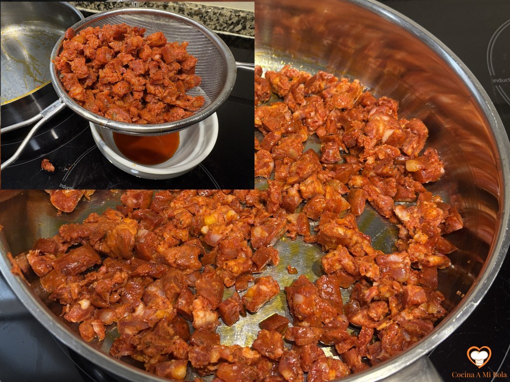 SEGUNDO.- Transcurridos unos diez minutos a fuego bajo verás que ha soltado una grasa rojo intenso que colaremos antes de que enfríe y dejaremos reservado el chorizo en el colador para que escurra lo más posible. La que haya quedado impregnada en el fondo de la sartén la dejaremos.