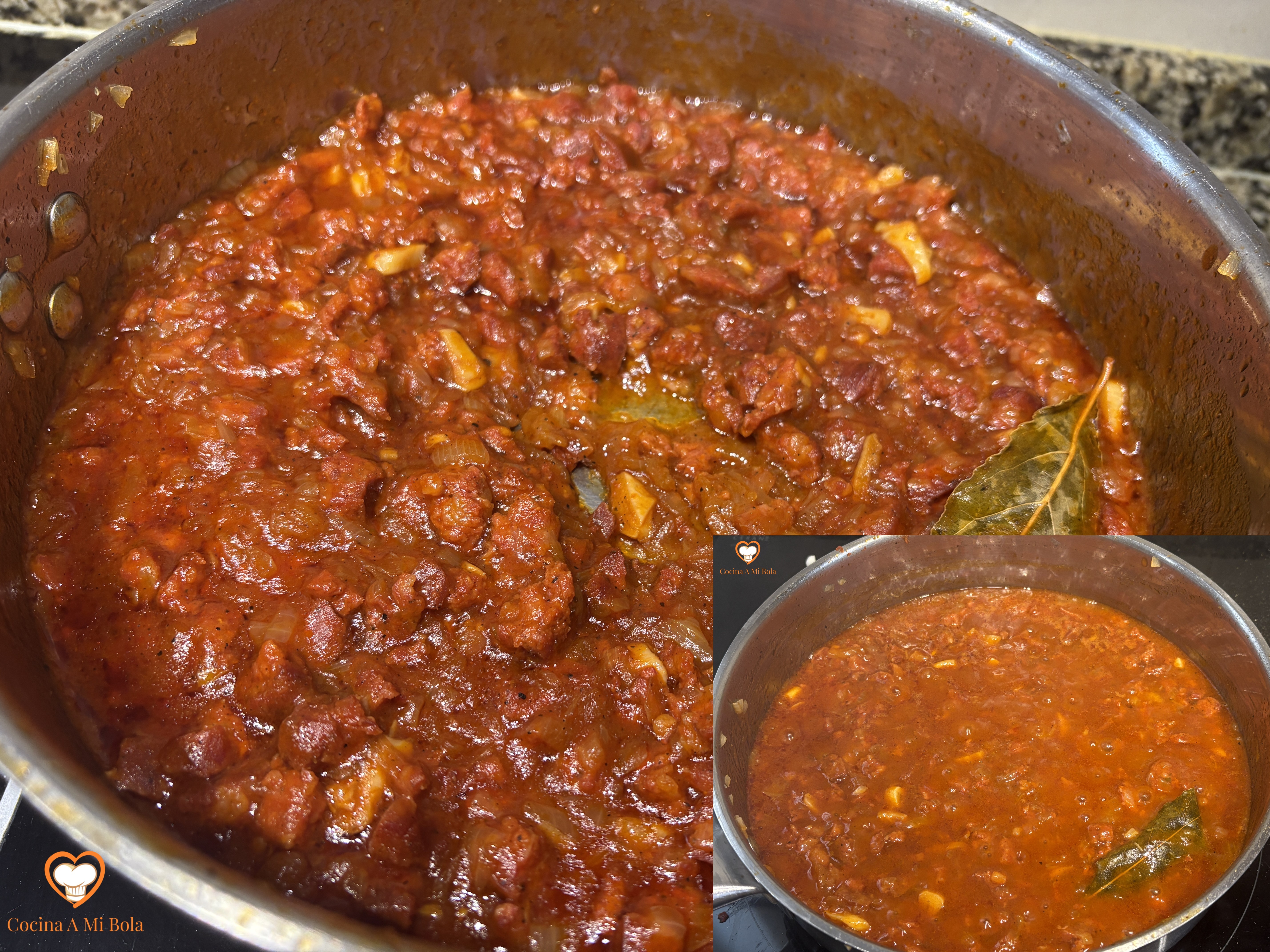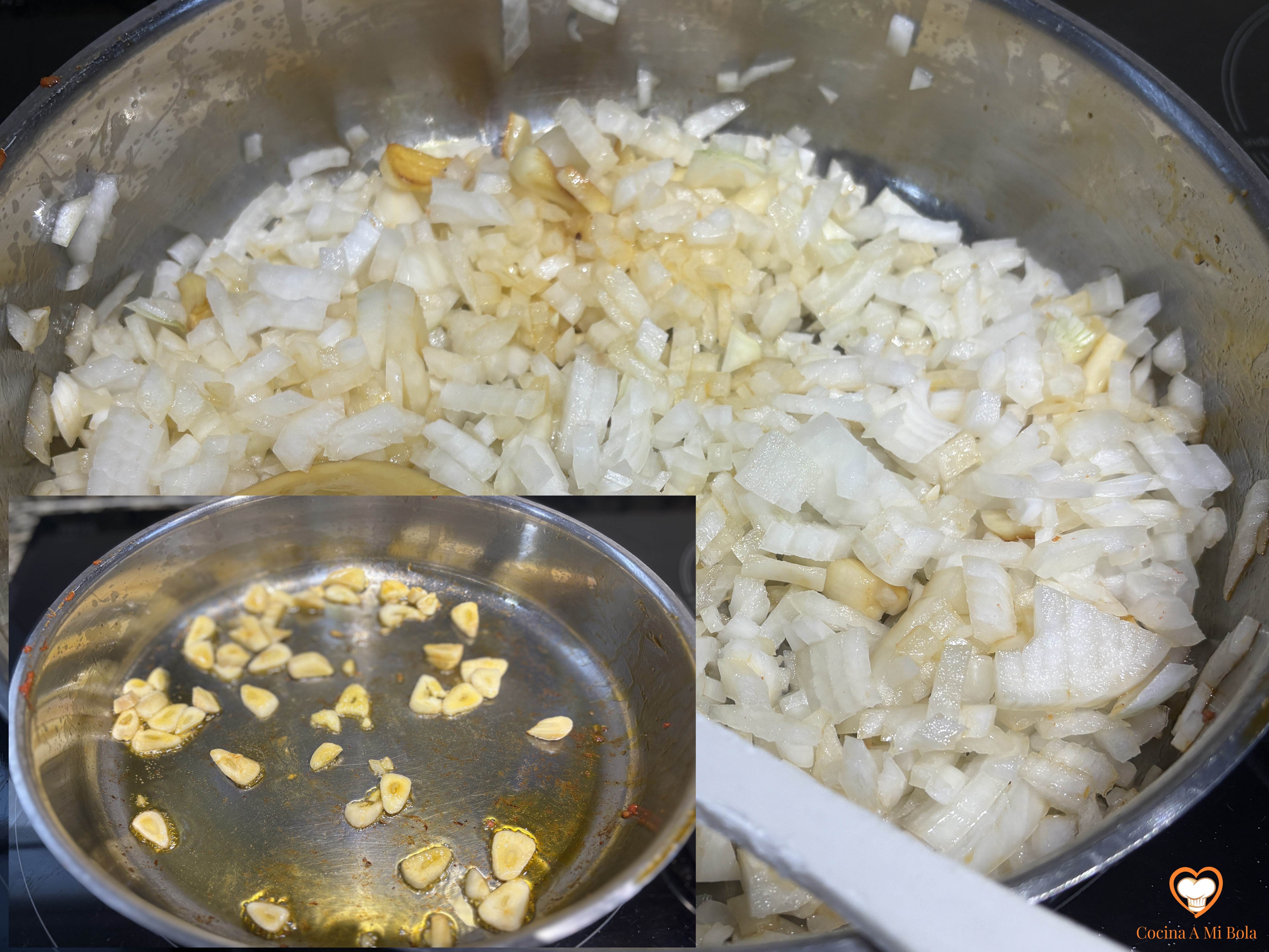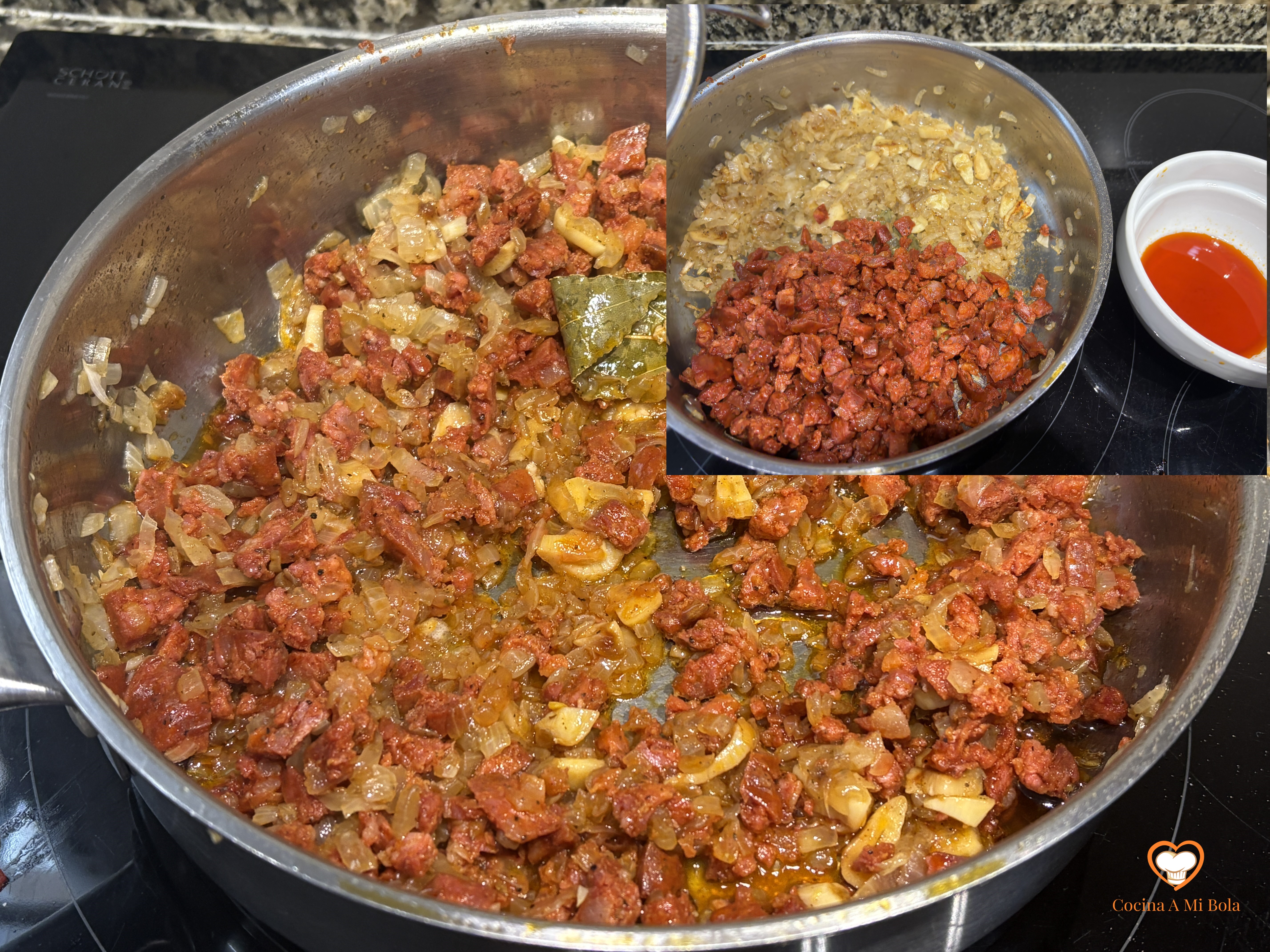 TERCERO.- Ahora picamos fina la cebolla, y el ajo en trozos algo mayores, y lo incorporamos a la sartén para que poche con esa grasa residual. Ponle una hoja de laurel. Puedes añadir algo de aceite de oliva si vieras que le hace falta, pero creo que no es necesario. Salpimenta.