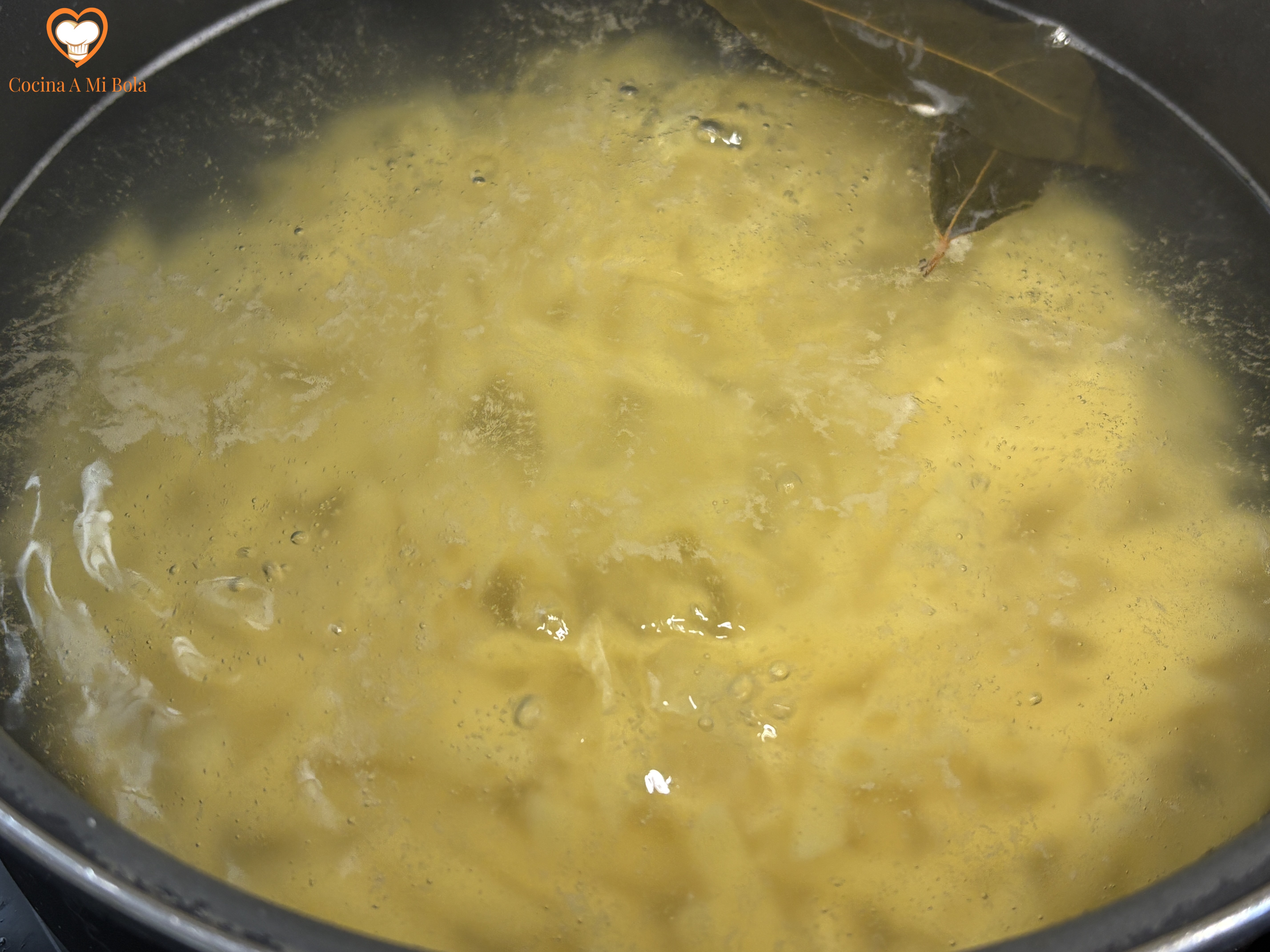 QUINTO.- Vamos a cocer la pasta: en abundante agua hirviendo echaremos dos puñados de sal, dos hojas de laurel y un chorrito de aceite de oliva virgen extra. Tras dos minutos hirviendo para que el laurel infusione, echaremos los macarrones y dejaremos que cuezan durante el tiempo que marque el fabricante (unos cinco minutos aprox.), removiendo de vez en cuando para que no se peguen. Ten en cuenta que para obtener una pasta sabrosa y bien cocida es muy importante guardar una proporción mínima de 0,75 litros de agua por cada cien gramos de pasta. No obstante, ya sabemos que la pasta sale bien siempre…