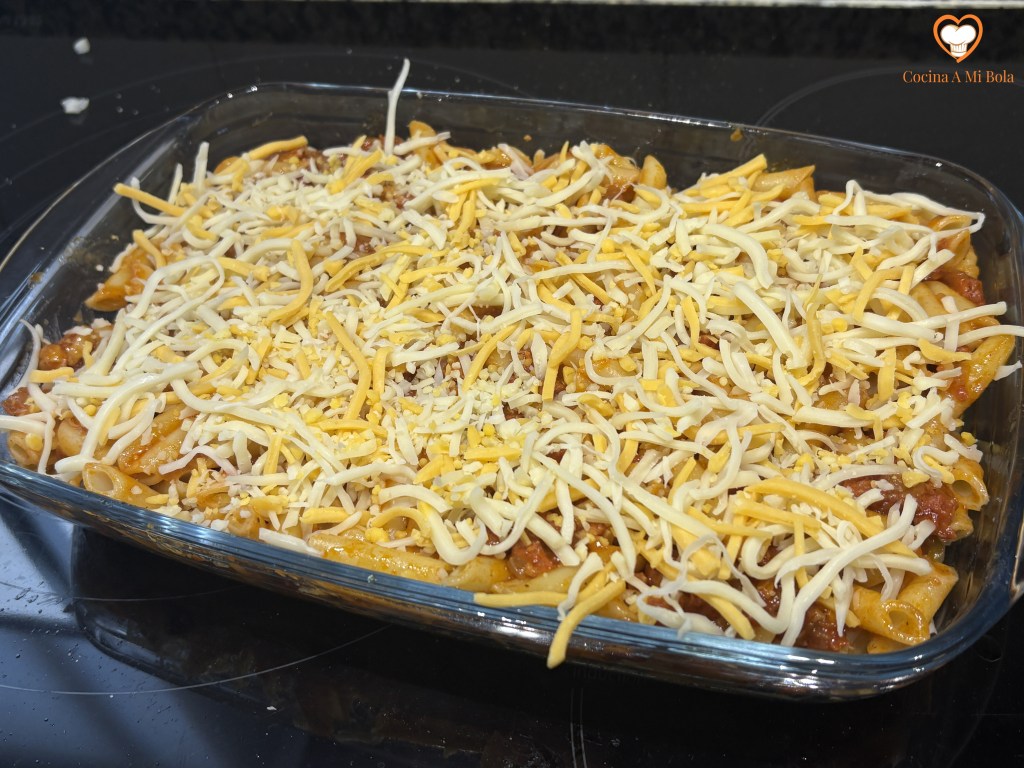 SÉPTIMO.- Ve precalentando el horno a 200ºC, calor arriba y abajo con circulación de aire. Y cuando esté listo echamos la mitad de la pasta en una fuente apta para horno sobre la que pondremos una capa de queso rallado de gratinar que funda bien. Después, echamos encima el resto de la pasta de forma que esa capa de queso quede en el medio. Y por último, cubrimos de nuevo la superficie con otra capa de queso rallado.