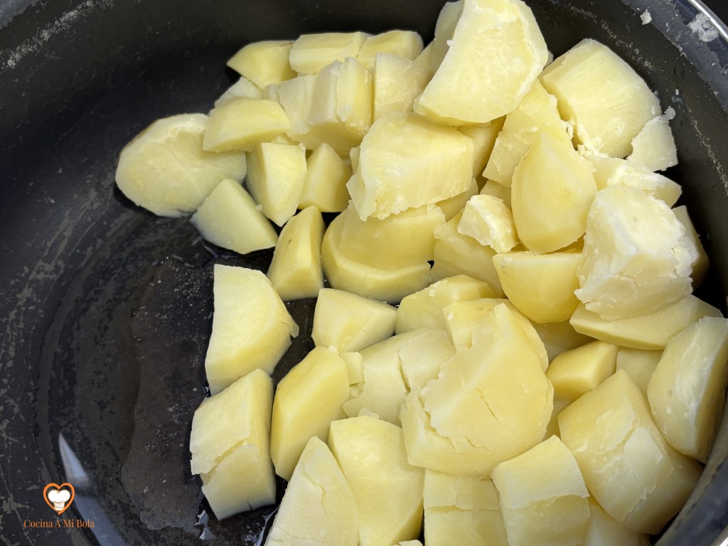 SEGUNDO.- Cuando como en este caso, las patatas son en trozos, las cuezo en cazuela con tapa y no en olla express, porque se hacen en muy pocos minutos y puedo controlar el punto de cocción. Serán unos 8-10 minutos con la tapa puesta y el fuego al mínimo siempre que mantenga el hervor.