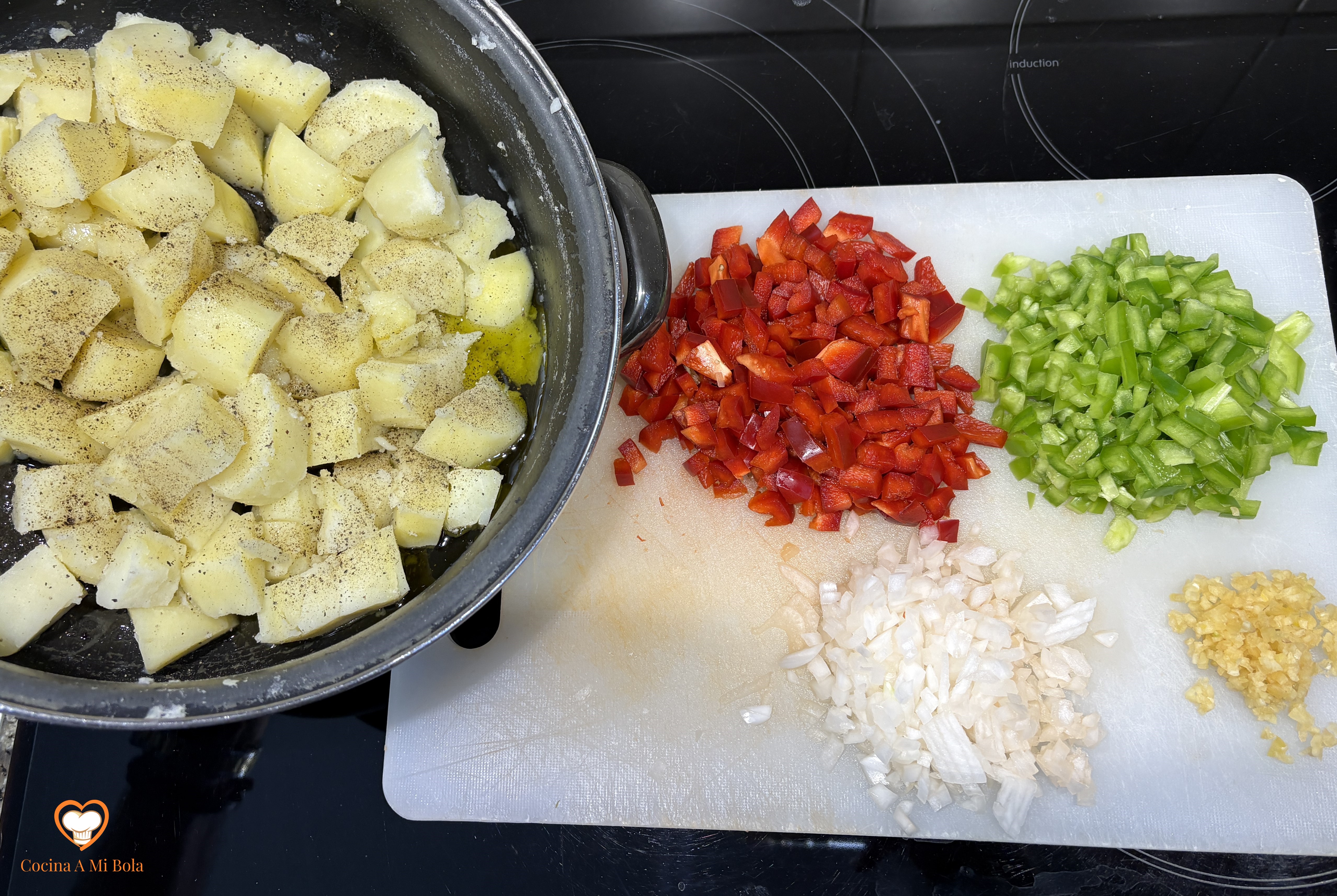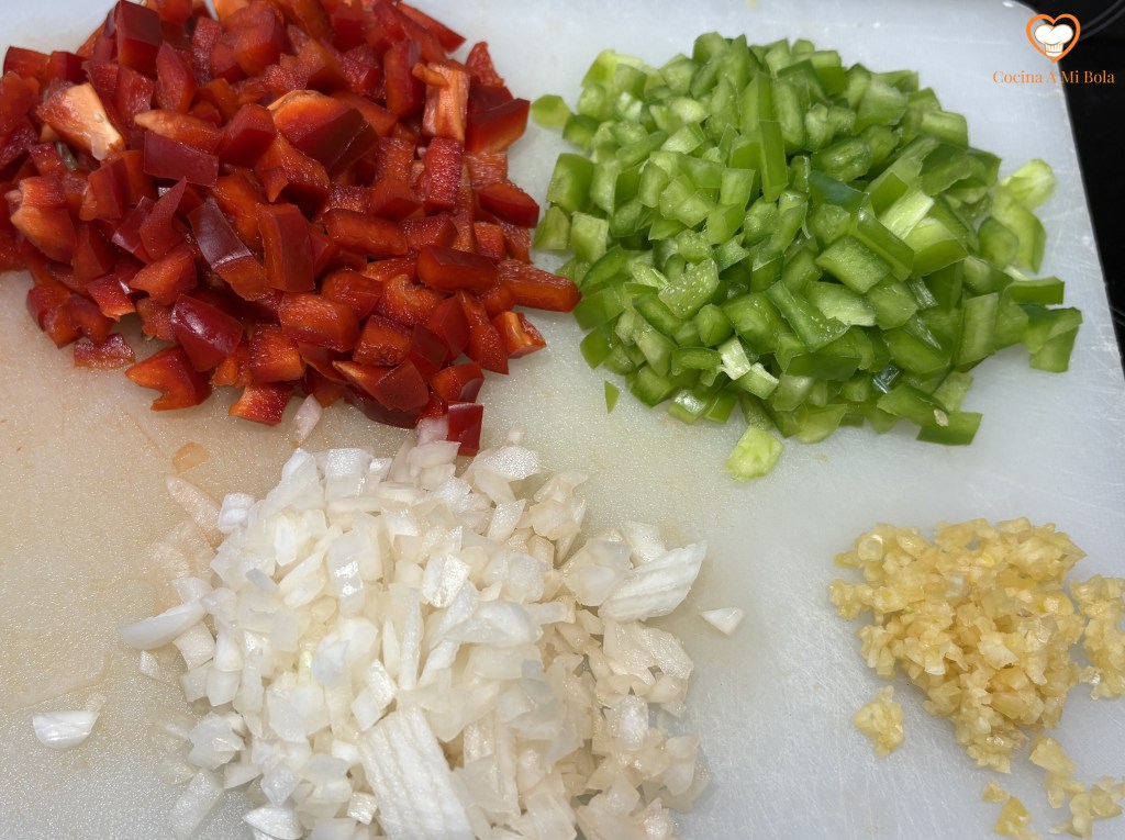 TERCERO.- Mientras cocemos las patatas, lavaremos bien los pimientos, los cortaremos en trocitos de 1×1 cm aproximadamente, pelaremos la cebolla y la picaremos en trocitos algo más pequeños que los pimientos y picaremos los dientes de ajo lo más posible.