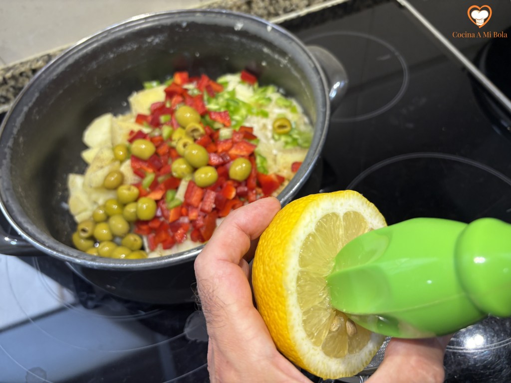 QUINTO.- Echa toda la picada en una fuente o en un bol, añade las aceitunas y exprime el limón sobre un colador para eliminar las pepitas y vuélcalo por encima. Mezcla bien.