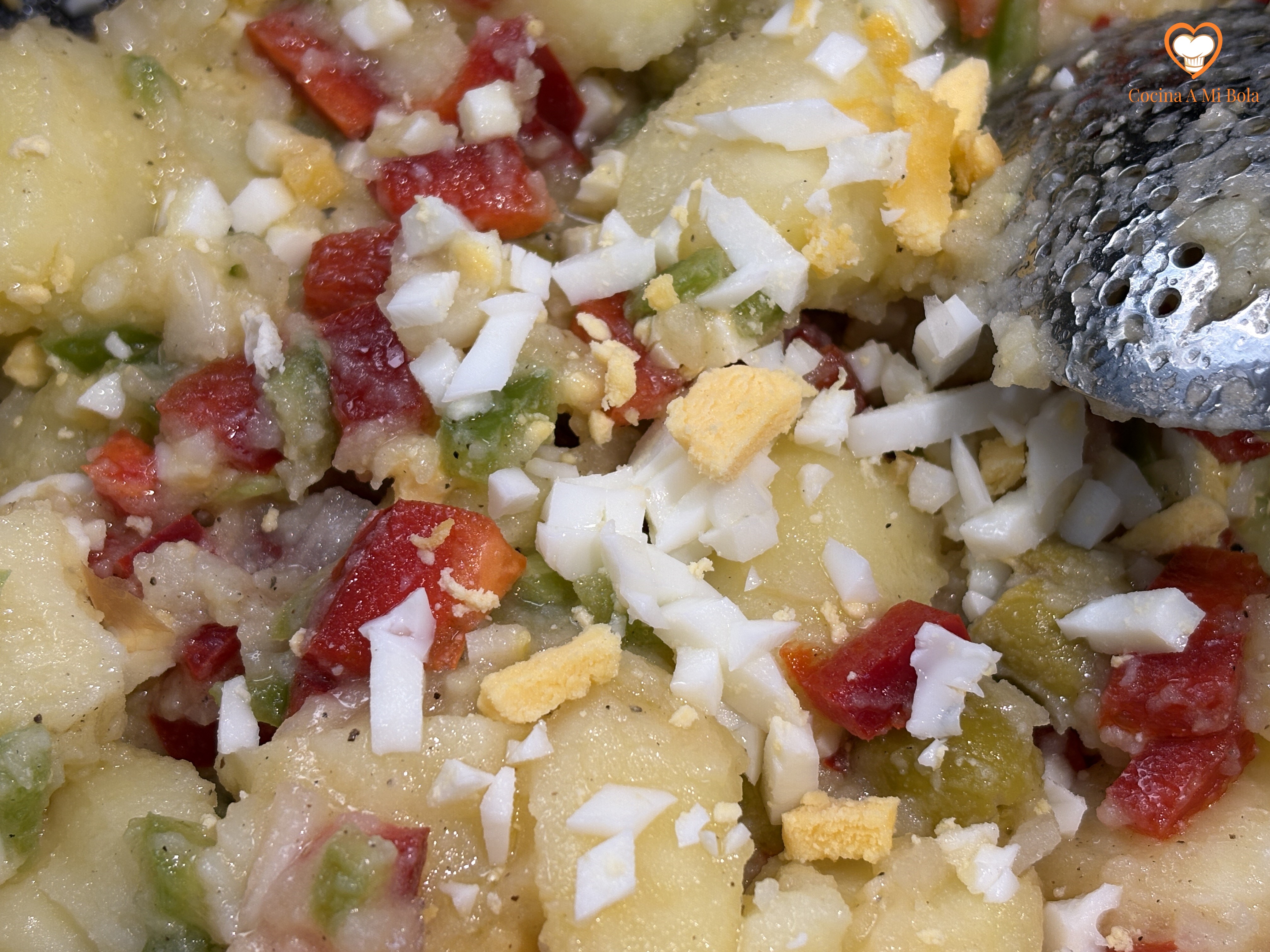 SÉPTIMO.- Añade ahora las patatas, que las hemos cocido con sal, ponle aceite de oliva virgen extra y remueve on mucho mimo para no convertir las patatas en puré. Verás que la patata absorbe mucho aceite y tendrás la sensación de que ha quedado escaso, pero no es así. Ponle cuanto quieras, pero no olvides que tiene más de 800 calorías por cada 100 gramos.