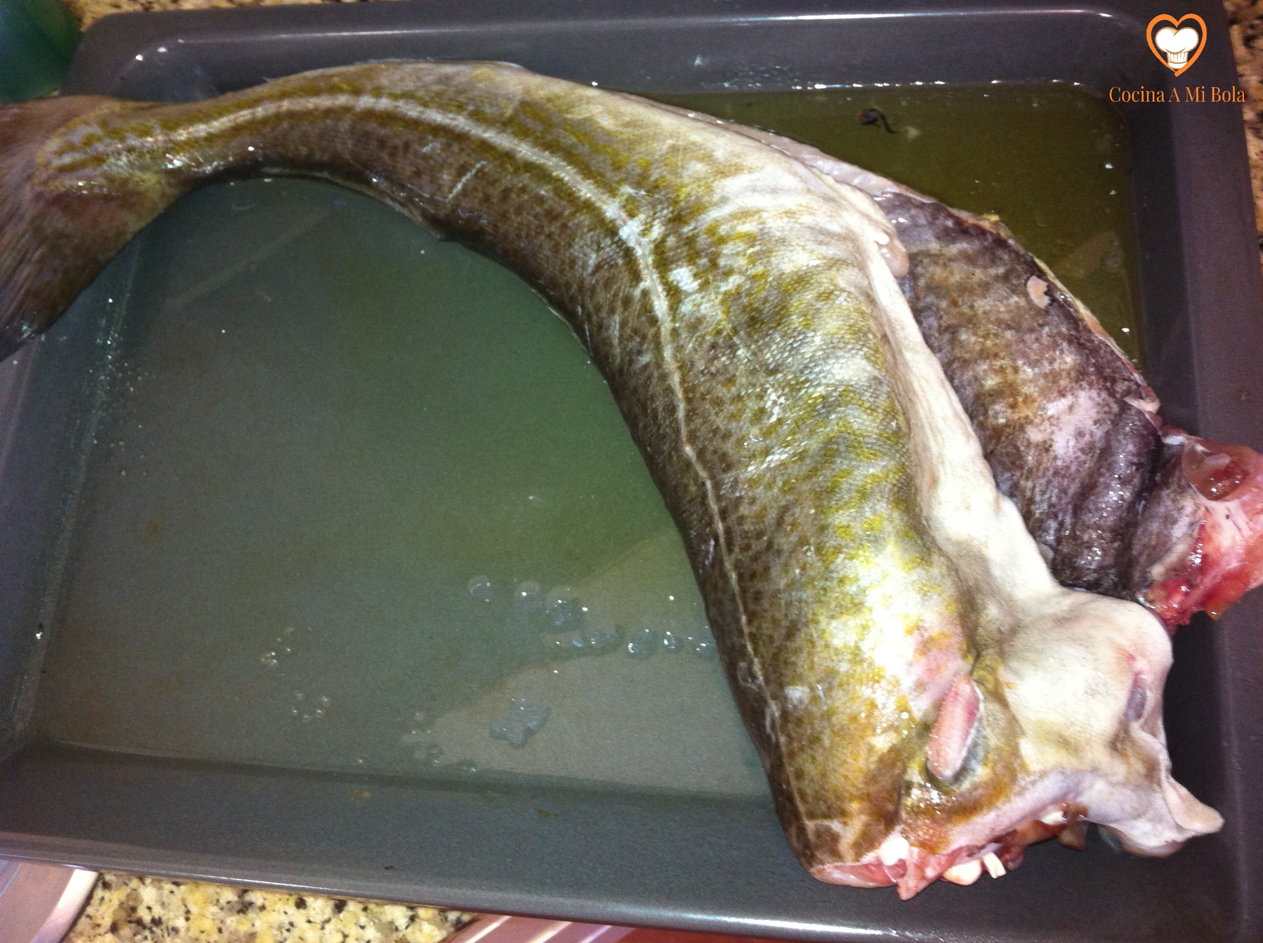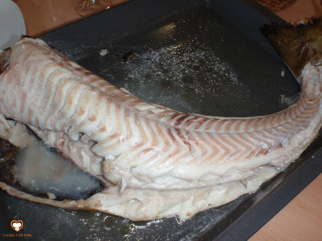PRIMERO.- Sugiero que sea de unos tres kilos porque se nos irán unos 700 grs en su enorme cabeza más lo que pierde en el horno y el peso de la espina, nos quedarán las raciones justas. Naturalmente, lo queremos limpio. Si no lo hiciera el pescadero, lo haremos nosotros rajándole el abdomen hasta la cabeza. Eliminaremos ésta metiendo el cuchillo por detrás de las agallas y cortaremos la espina central. La cabeza puedes congelarla para hacer un buen fumet en otra ocasión.