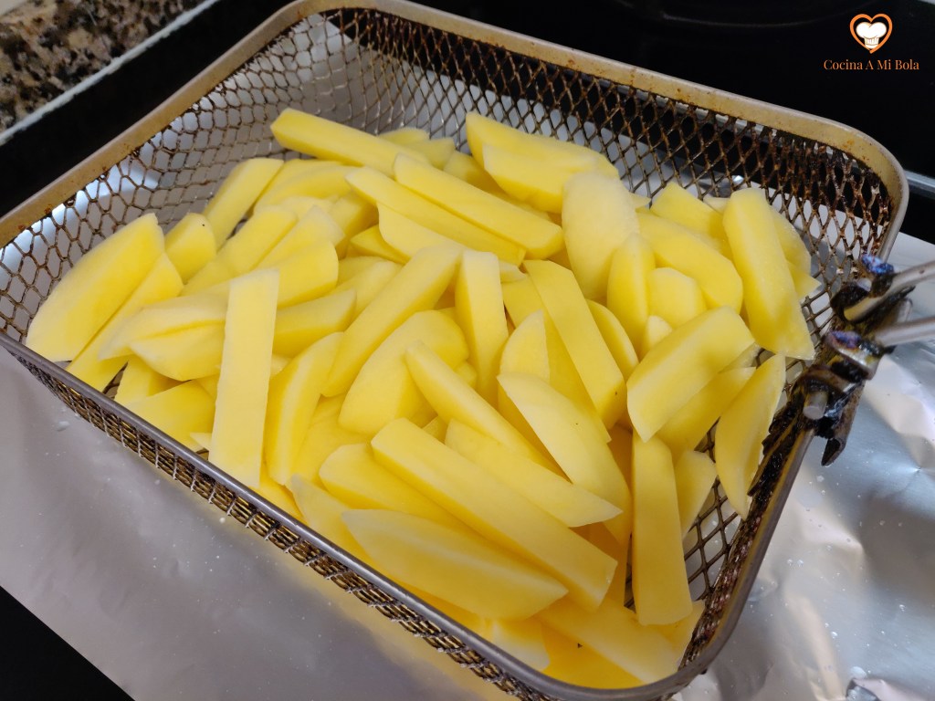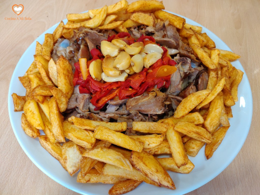 OCTAVO.- Pelamos las patatas y las cortaremos en tiras. Cuando el cordero haya enfriado lo suficiente, lo deshuesaremos y lo trocearemos, pero con las manos, no cortado a cuchillo. Colocamos ordenadamente los trozos en el centro de una fuente redonda. Freiremos las patatas y las pondremos rodeando el cordero, encima del cual irá el pimiento en tiras y los ajos asados a modo de copete.