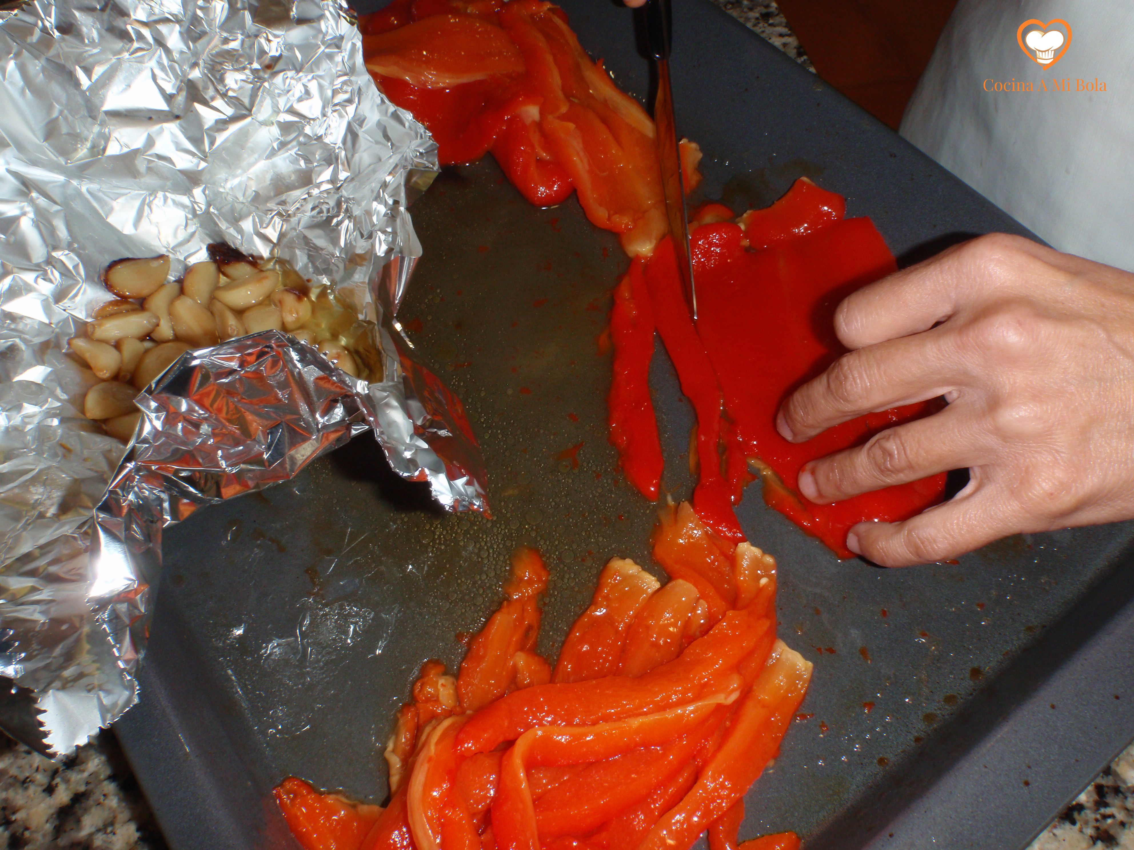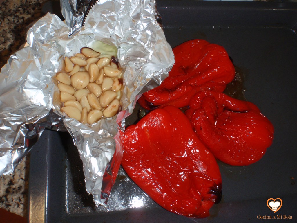 PRIMERO.- Lo primero que haremos es asar los pimientos como de costumbre, es decir, embadurnándolos con las manos en aceite de oliva y unos veinticinco minutos a horno precalentado a 180ºC, ventilación y calor arriba y abajo. (Sigue las instrucciones de asado de la receta Pote de Pimientos -click aquí-). Al tiempo, haremos un paquete con papel de aluminio sin apretarlo y meteremos los dientes de ajo pelados con un chorrillo de aceite de oliva, y lo pondremos en la misma bandeja. Luego, sácalo del horno y cúbrelo con hojas de periódico, lo que nos permitirá pelar los pimientos más fácilmente  cuando enfríen.
