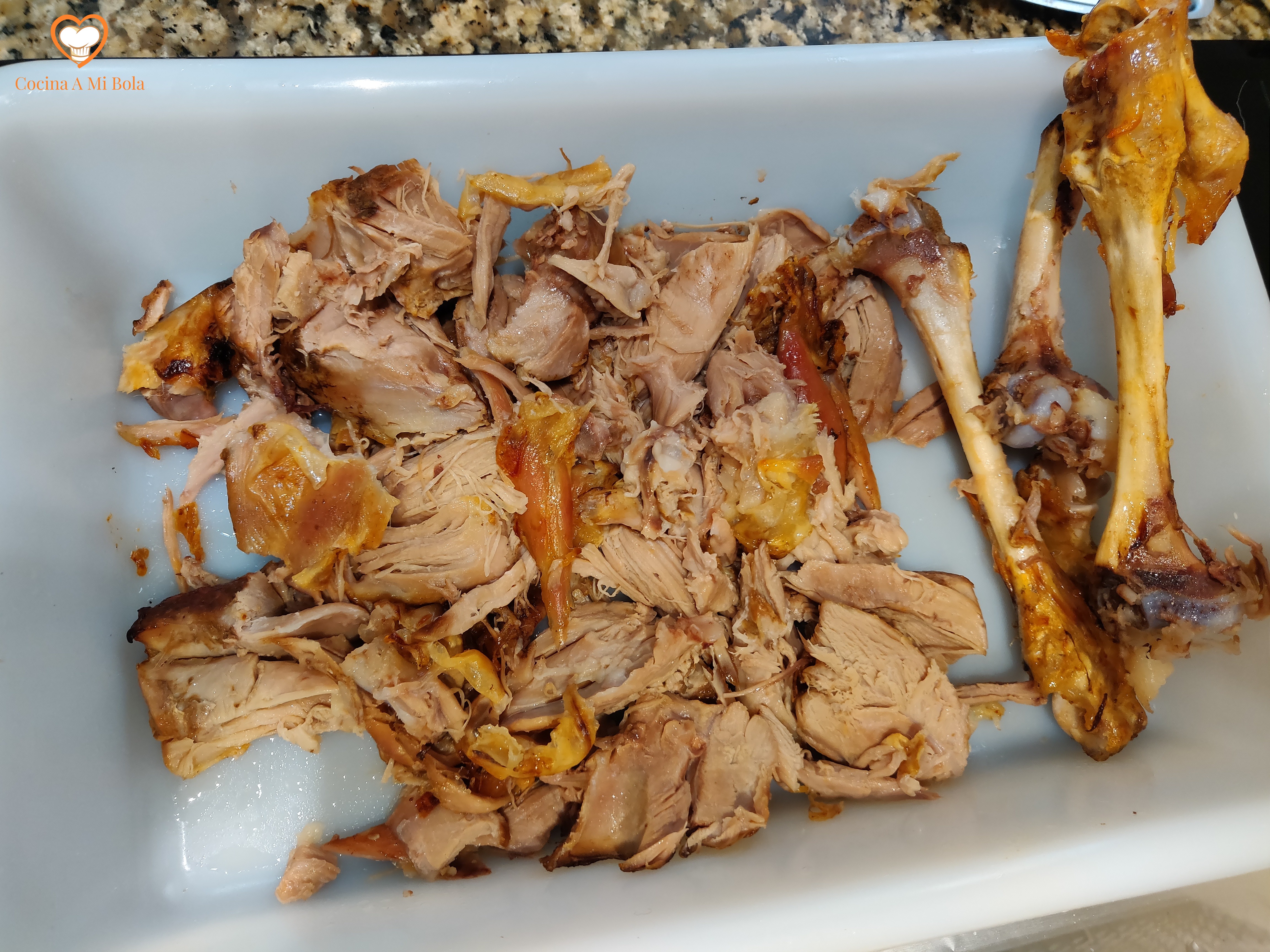 NOVENO.- Aunque el cordero sale bastante jugoso, haremos una salsa batiendo el caldo de la olla, hecha a base de agua, vino, los jugos del cordero, los aromas de las hierbas (no olvides sacar el laurel y el romero antes) y la cebolla, a la que agregaremos un poco del jugo de asar los pimientos. La textura de esta salsa va en gustos. Así como te lo describo, es súper líquida, pero si quieres, puede espesarla con una cucharada de Maizena disuelta en medio vasito de agua que echaremos sobre la salsa en ebullición y removiendo para integrarlo todo. Llévala a la mesa en una salsera como opción, ya que este plato tal y como ves en la foto es magnífico. La salsa es un complemento perfecto, pero accesorio.