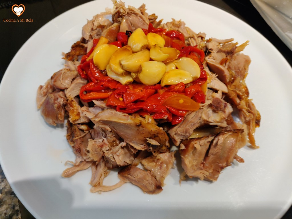 SÉPTIMO.- Cumplidos los tiempos, abrimos con cuidado, dejando que salga el vapor y que temple mientras pelamos los pimientos y los cortamos en tiras, que ya no estarán calientes y podremos manipularlos.