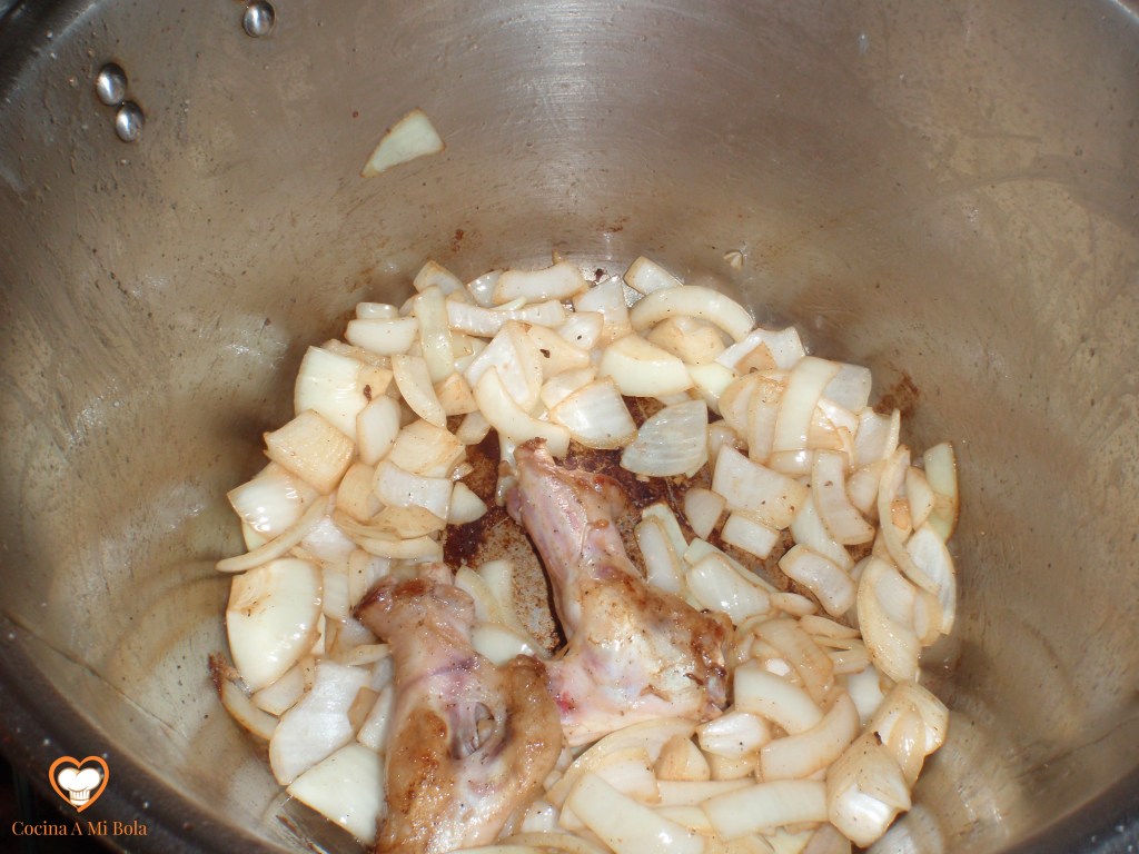 CUARTO.- Salpimentaremos con cierta generosidad las piezas, las aderezamos con tomillo y las doraremos bien echando un poco de aceite de oliva en el fondo de la olla express. Mientras se va haciendo, pelaremos las cebollas y las cortaremos en trozos gruesos.