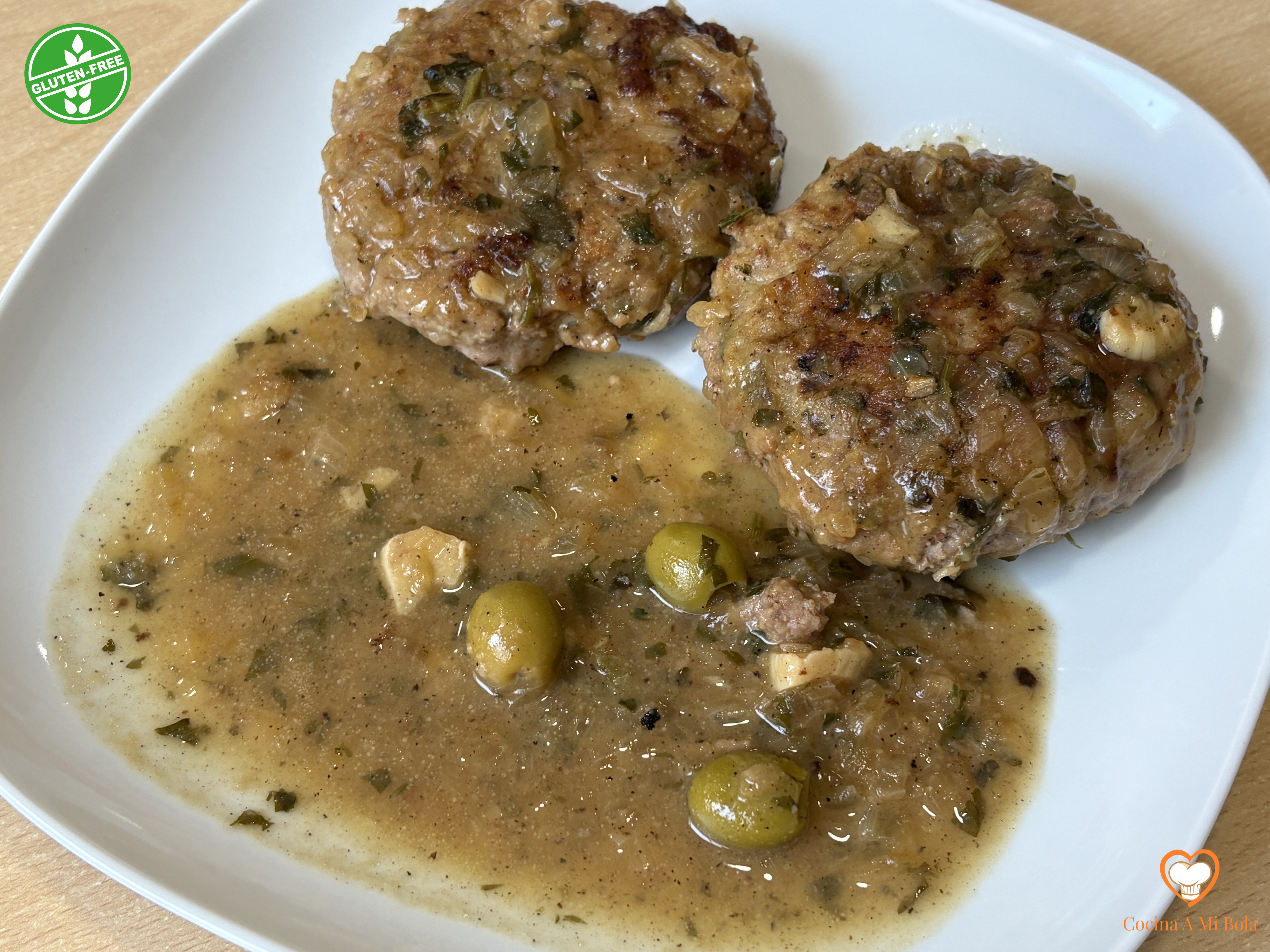 INGREDIENTES:  700 grs carne picada de ternera, 700 grs carne picada de cerdo, 1 huevo, 70 gr miga de pan duro mojado, 100 grs tomate frito, 1/2 paquete de aceitunas sin hueso, pimienta negra molida, una pizca de nuez moscada, 2 cucharadas de harina de arroz, 2 cucharadas de harina de garbanzo y aceite de oliva. Para la salsa: 2 cebollas, 6 dientes de ajo, 1/2 paquete de aceitunas verdes sin hueso, 1 vasito de vino blanco, pimienta negra molida, perejil picado fresco, nuez moscada, aceite de oliva virgen extra, 2 hojas de laurel, agua y sal.
