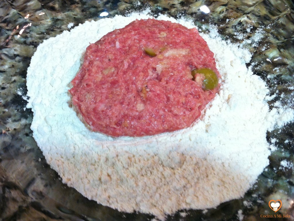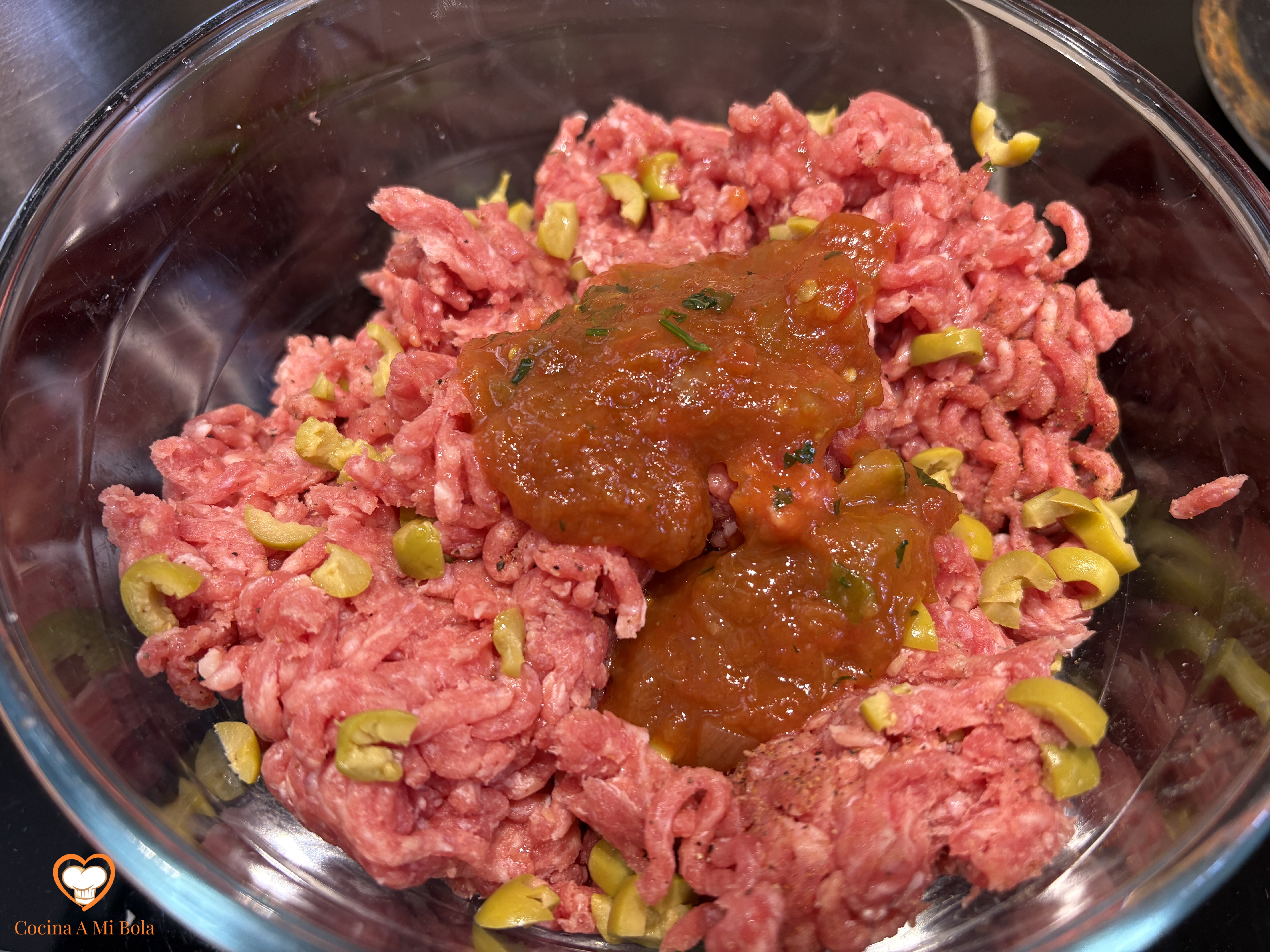 TERCERO.- Aliña bien la carne a base de sal, pimienta negra molida, algo de nuez moscada, dos cucharadas de tomate frito y un huevo. Cortar la mitad de las aceitunas en dos o tres trozos cada una, agregar a la carne de forma repartida y mezclar a conciencia.
