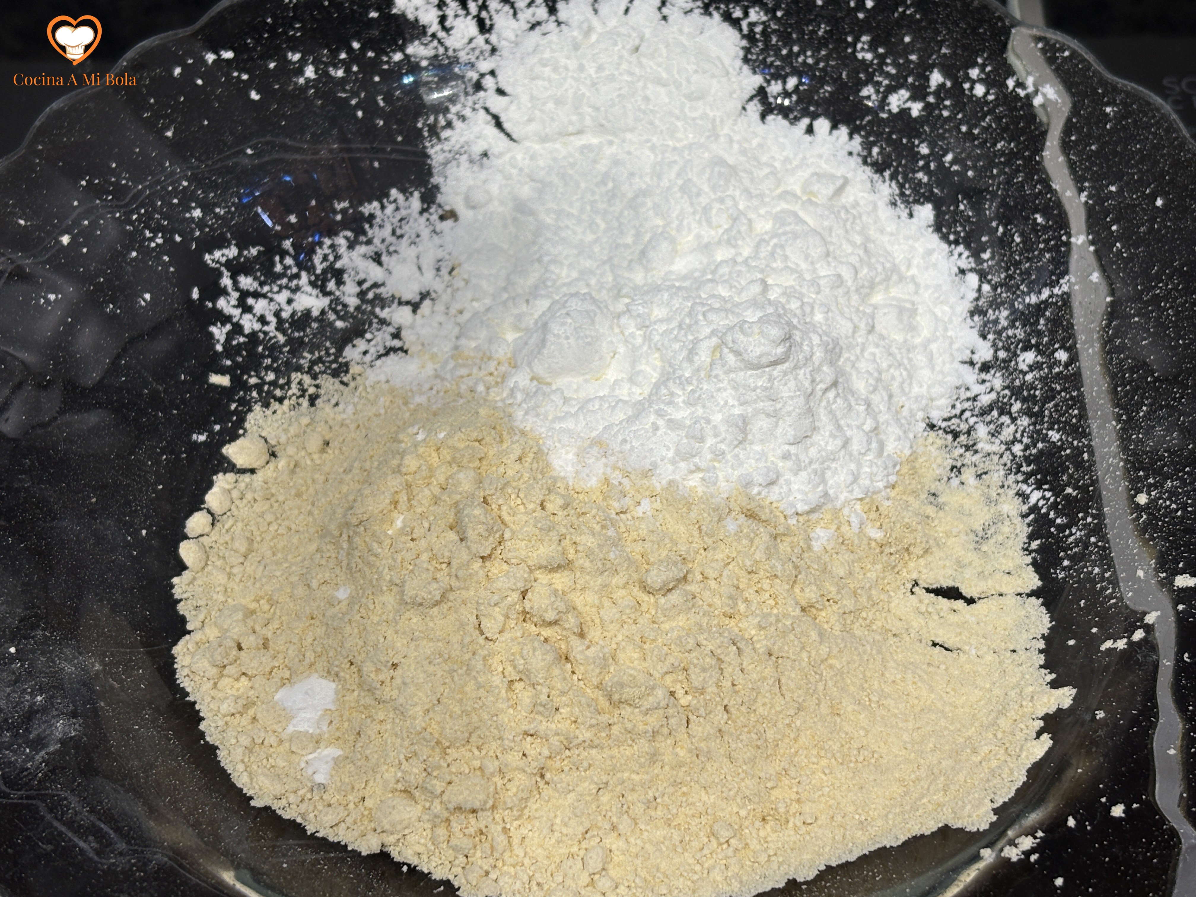QUINTO.- Mezcla ambos tipos de harina y, si es necesario, tamízalas juntas para que se unifiquen bien. Utilizamos estas harinas para hacer de esta receta un plato apto para celiacos, pero la de garbanzo contribuye además a que las hamburguesas tomen un tueste especial.