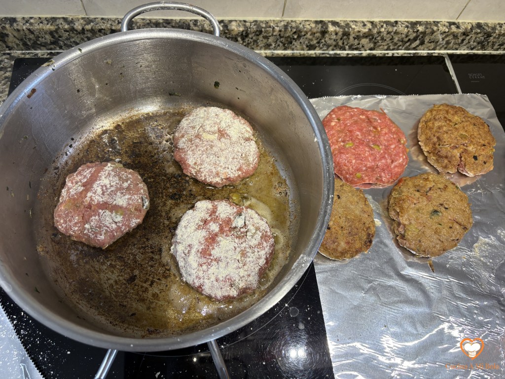 SEXTO.- Pasa las hamburguesas por harina y dóralas en aceite de oliva caliente. (Utiliza una cazuela amplia donde nos quepan luego las hamburguesas holgadamente). No se trata de que se hagan por dentro sino que se forme una costra exterior dorada que le dé buen aspecto y conserve la mayor cantidad de jugos posible en su interior. Las iremos reservando sobre papel absorbente para eliminar el exceso de grasa.