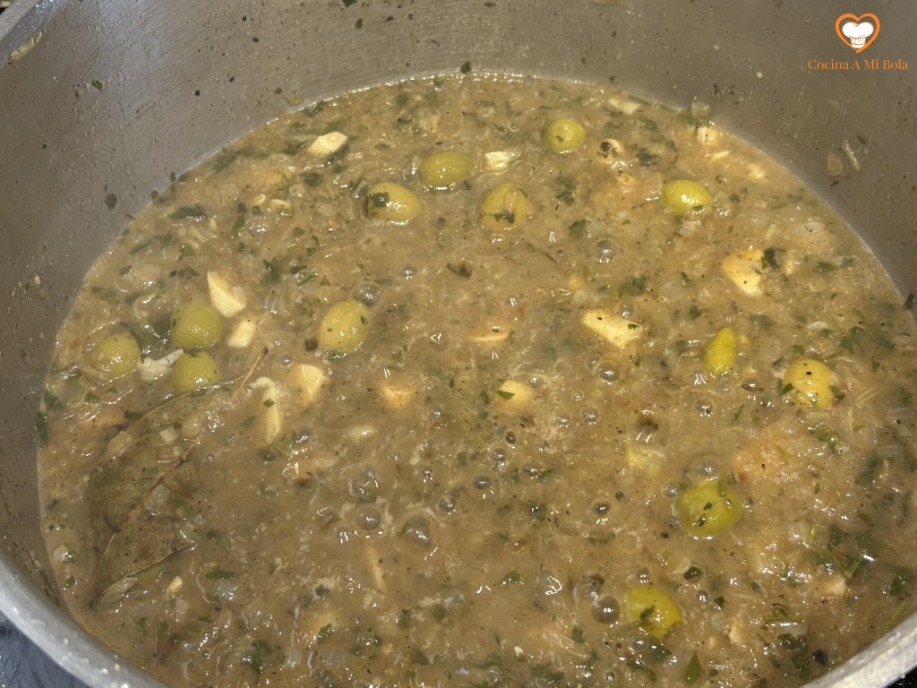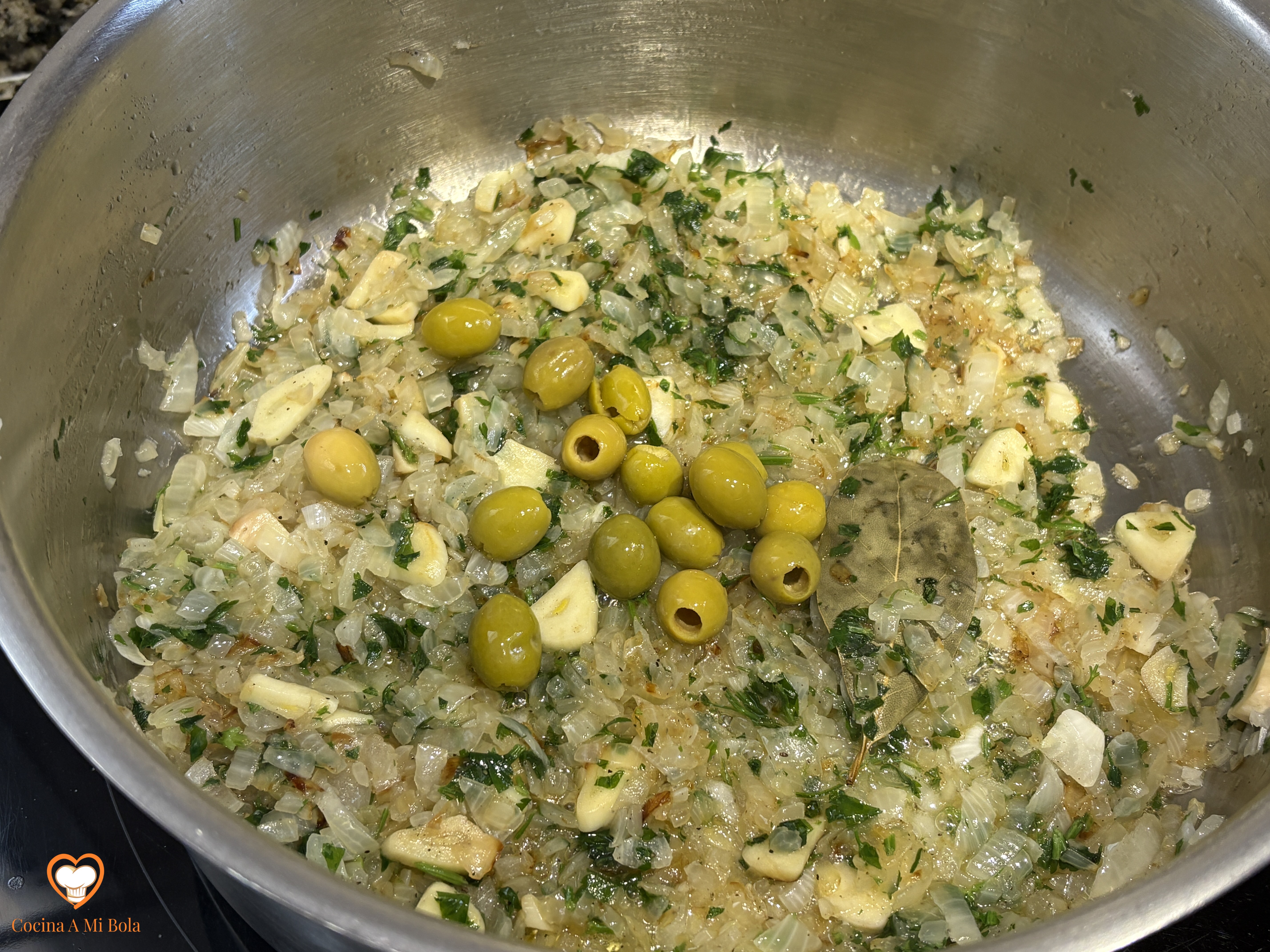 SÉPTIMO.- Y vamos con la salsa; para lo que picaremos la cebolla y los ajos, y lo pondremos todo a rehogar en la misma cazuela añadiendo algo más de aceite de oliva sólo si fuera preciso. Añade la otra mitad de las aceitunas, en este caso enteras, 2 hojas de laurel y perejil picado. Podremos poner fuego fuerte a ratillos para que se tueste un poco y tome sabor la cebolla pero sin que se queme. Salpimenta y adereza con una punta de nuez moscada.
