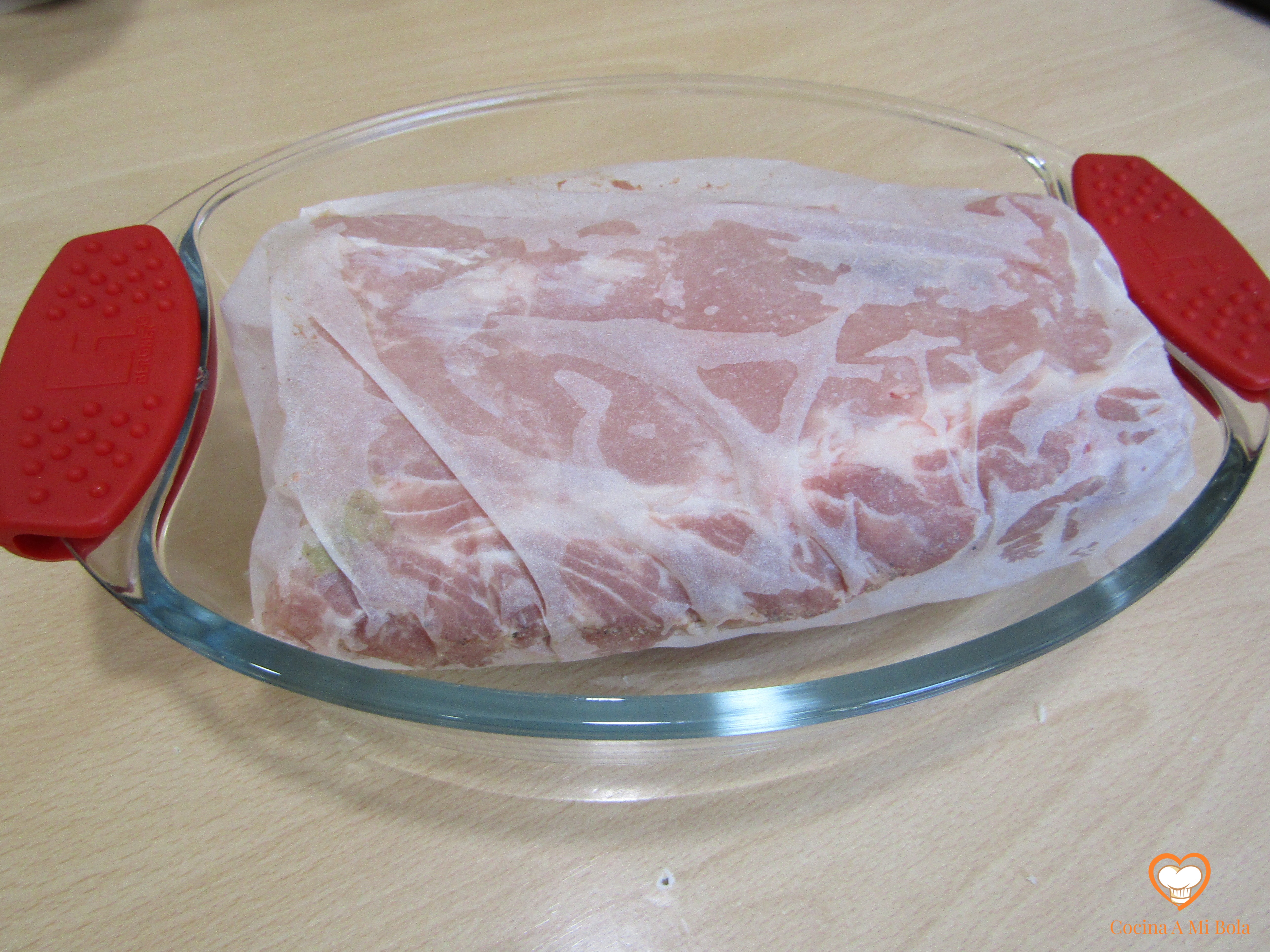 CUARTO.- El método de cocinado que vamos a usar es idéntico al de la receta de Lomo al papillote y que se resumo a continuación: extenderemos sobre la encimera papel de horno (papillot) suficiente para la pieza de carne que tenemos macerando, la cual pondremos sobre aquél y lo envolveremos de tal modo que no quede ningún resquicio ni abertura.