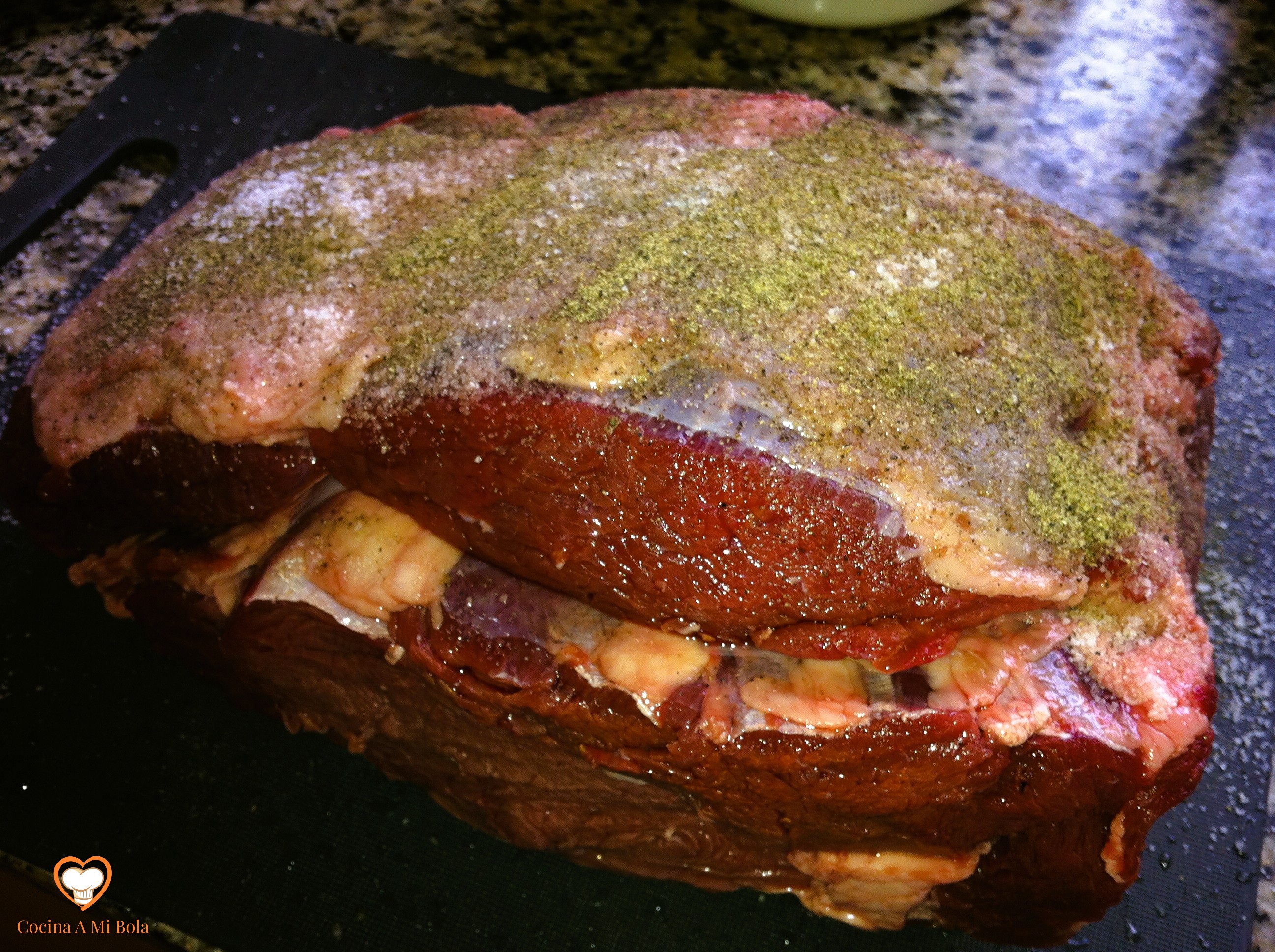 SEGUNDO.- Podemos atarla un poco con lid de cocina para que no se abra, pero como veis, yo no lo he hecho y sale razonablemente entera. El enmallado es sólo una mera cuestión estética evitando que se abra durante la cocción. Quitaremos la grasa exterior de la pieza sólo si fuera mucha. Aunque suelo eliminar el exceso, en este caso es un sabor esencial del que no debemos privar al roastbeef. La embadurnamos por el exterior con sal y pimienta negra y la frotaremos con unas gotas de aceite de oliva virgen extra. Si esto lo pudieras hacer la víspera y guardarla en la nevera envuelta en film de cocina, estupendo. Si no, pues nada. Saldrá estupenda también.