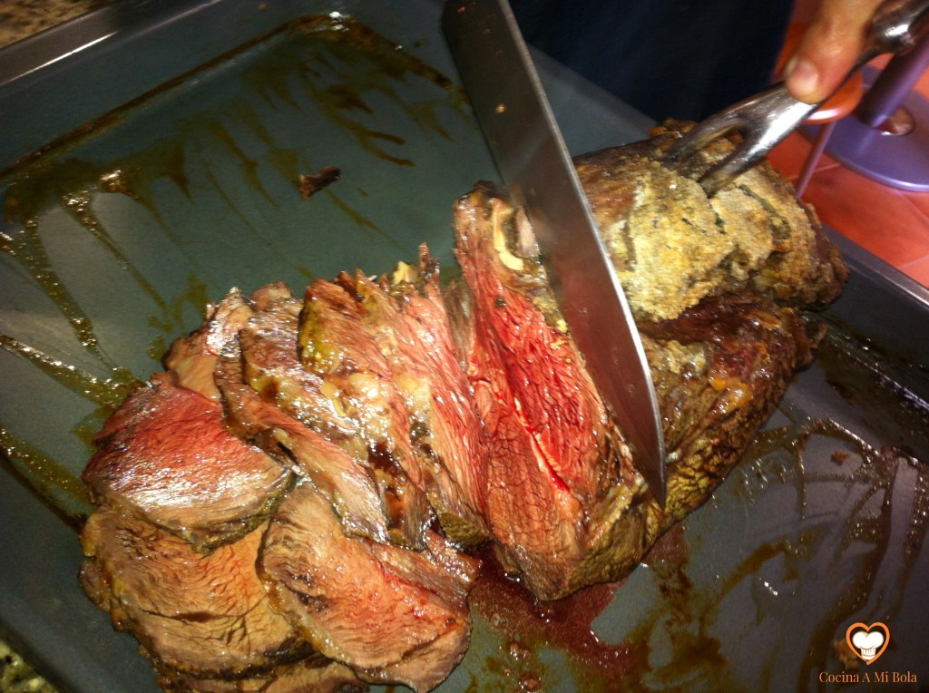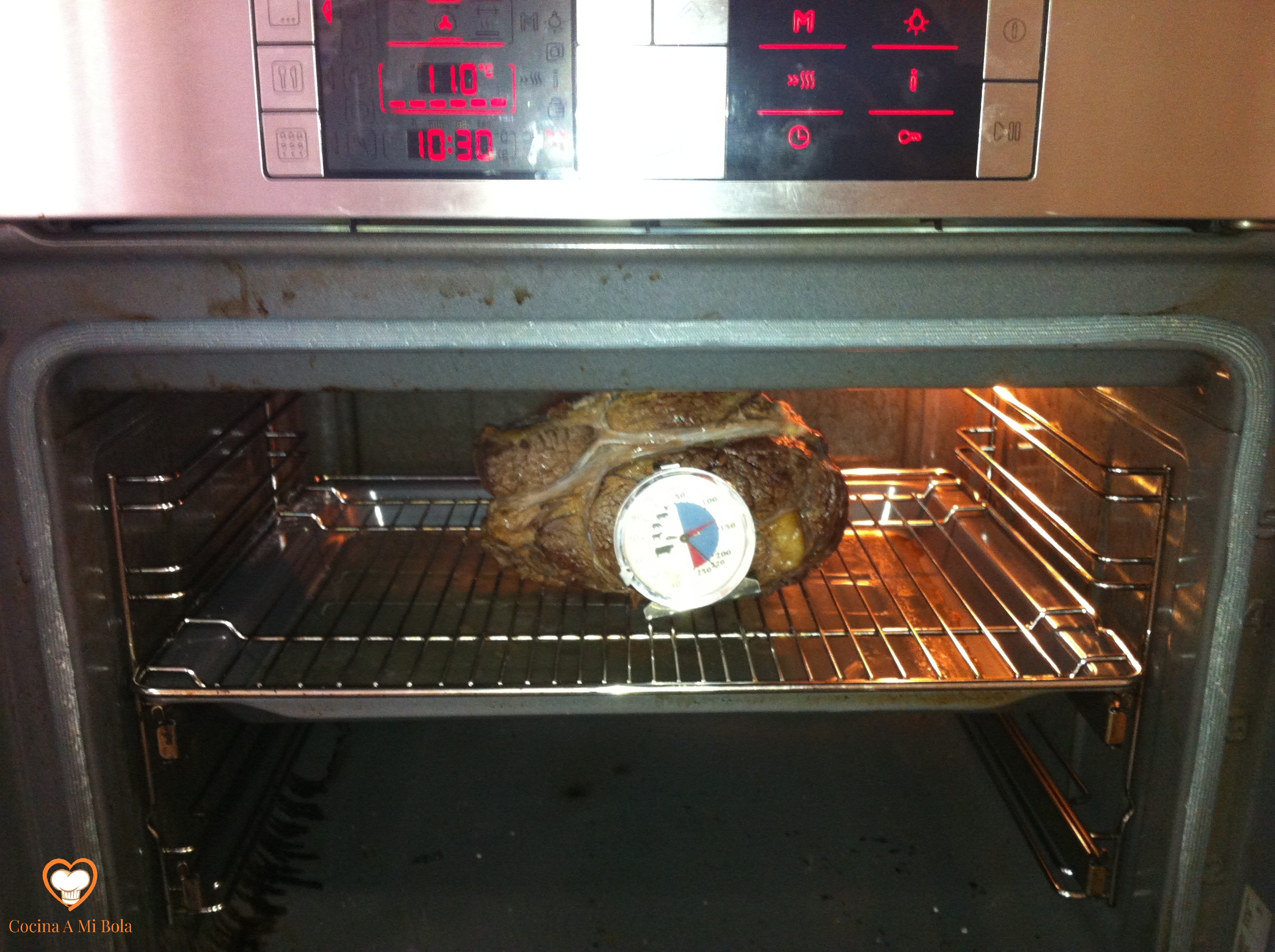 QUINTO.- La meteremos en el horno precalentado a 230ºC a la mayor altura que nos quepa, y tras 10 minutos, bajamos a 110ºC dejándolo así hasta que la temperatura interior alcance los 50ºC. Ya sabéis que yo no soy muy de tiempos ni de cifras pero esto es importante porque buscamos un punto de precocción que se alcanza muy poco a poco. Si pasamos de los 55ºC, empezará a secarse porque hay que tener en cuanta la inercia. Es decir, que aunque saquemos la carne del horno, seguirá subiendo la temperatura interior durante un rato -cocinándose- hasta que se estabilice y comience a bajar. El horneado tardará al menos 90 minutos, así que paciencia y vigilando el termómetro.