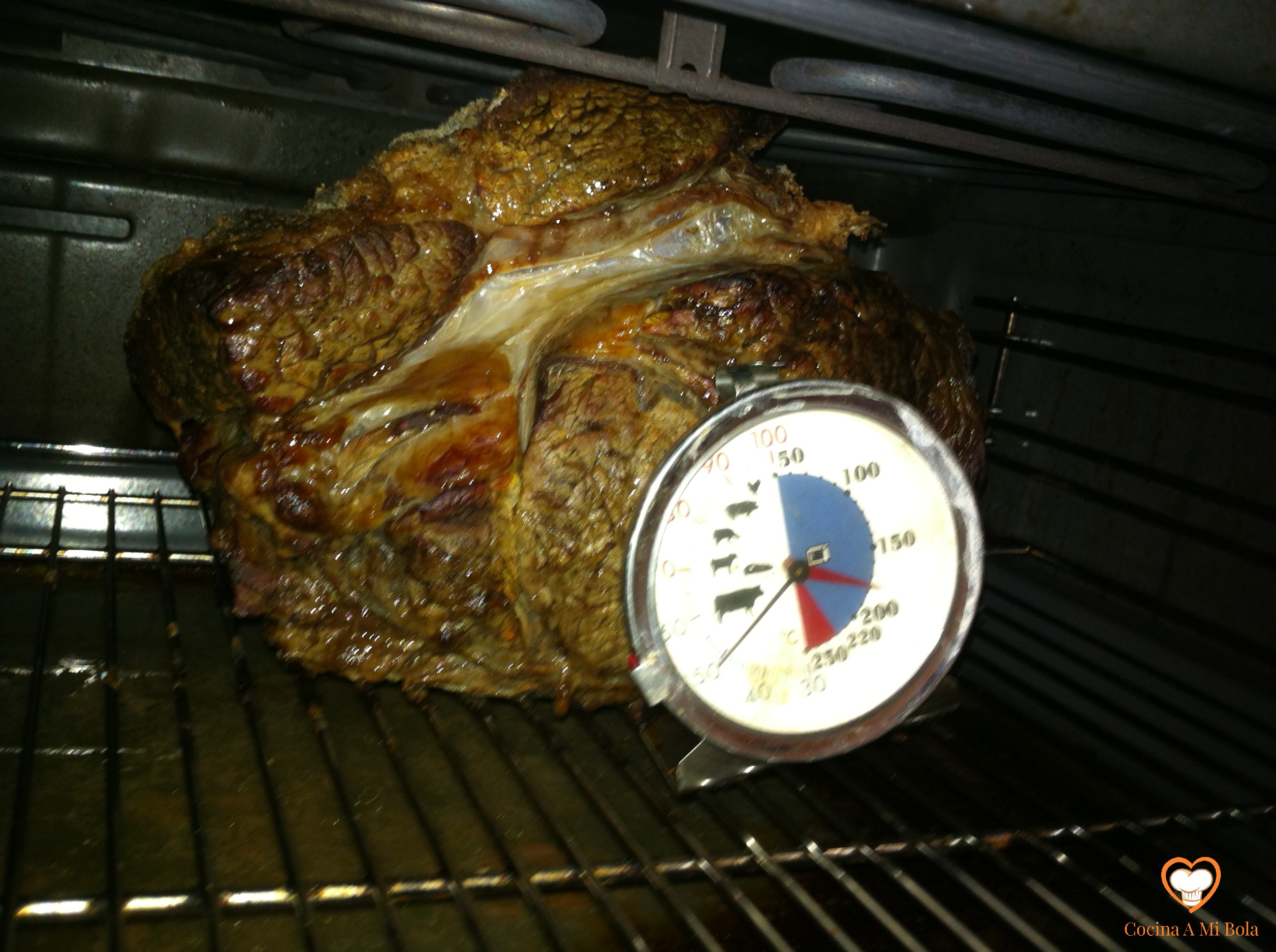 CUARTO.- Pon la carne en la rejilla del horno dejando debajo la bandeja para que recoja los jugos y echa en ella medio vaso de agua para humedecer un poco el ambiente. Pínchale la sonda de temperatura en lo más profundo. Necesitaremos saber la temperatura del corazón de la pieza. Cuando hice esta receta, allá por 2012, no había las sondas inalámbricas que hay ahora (2026) que facilitan mucho la tarea con la máxima precisión.